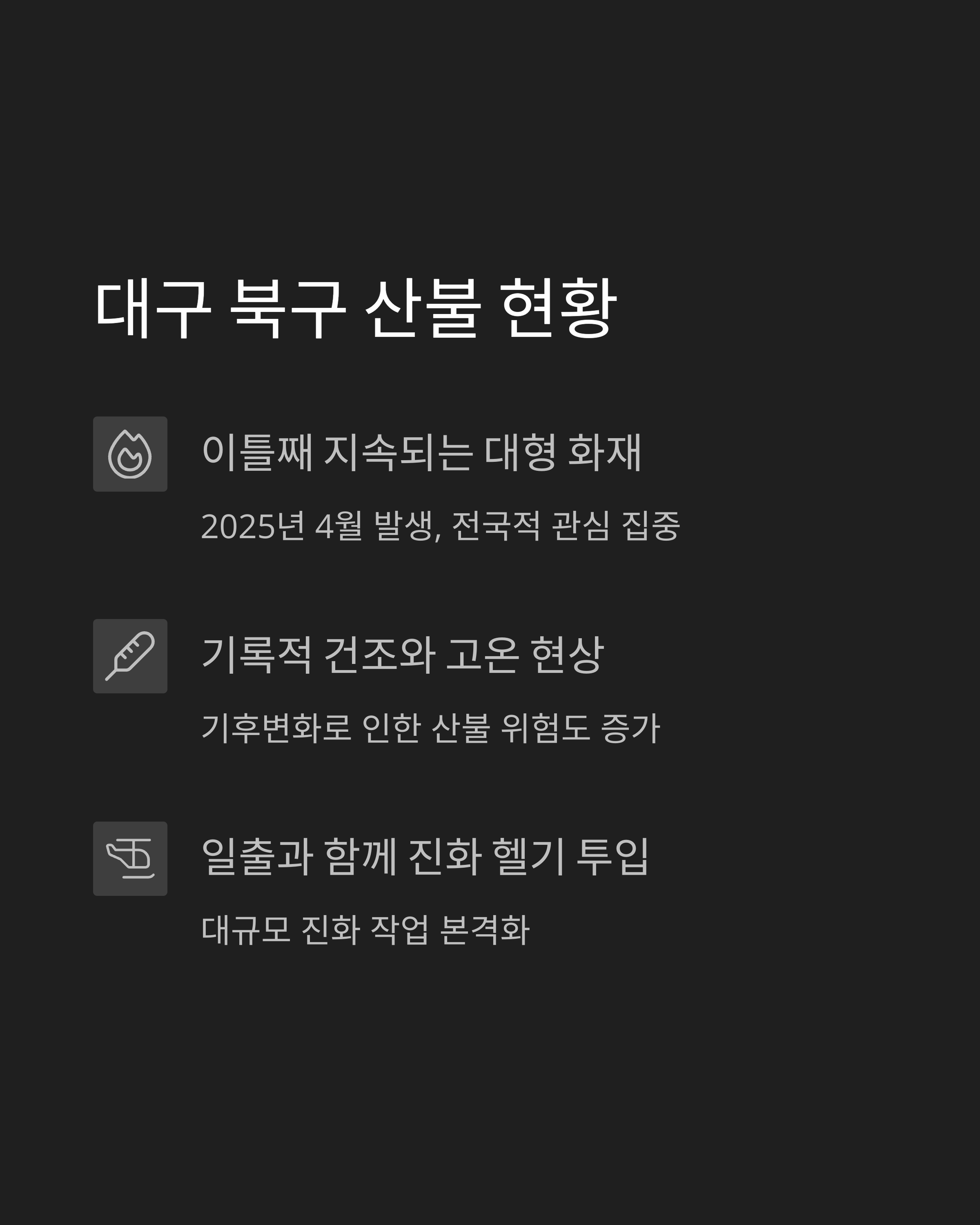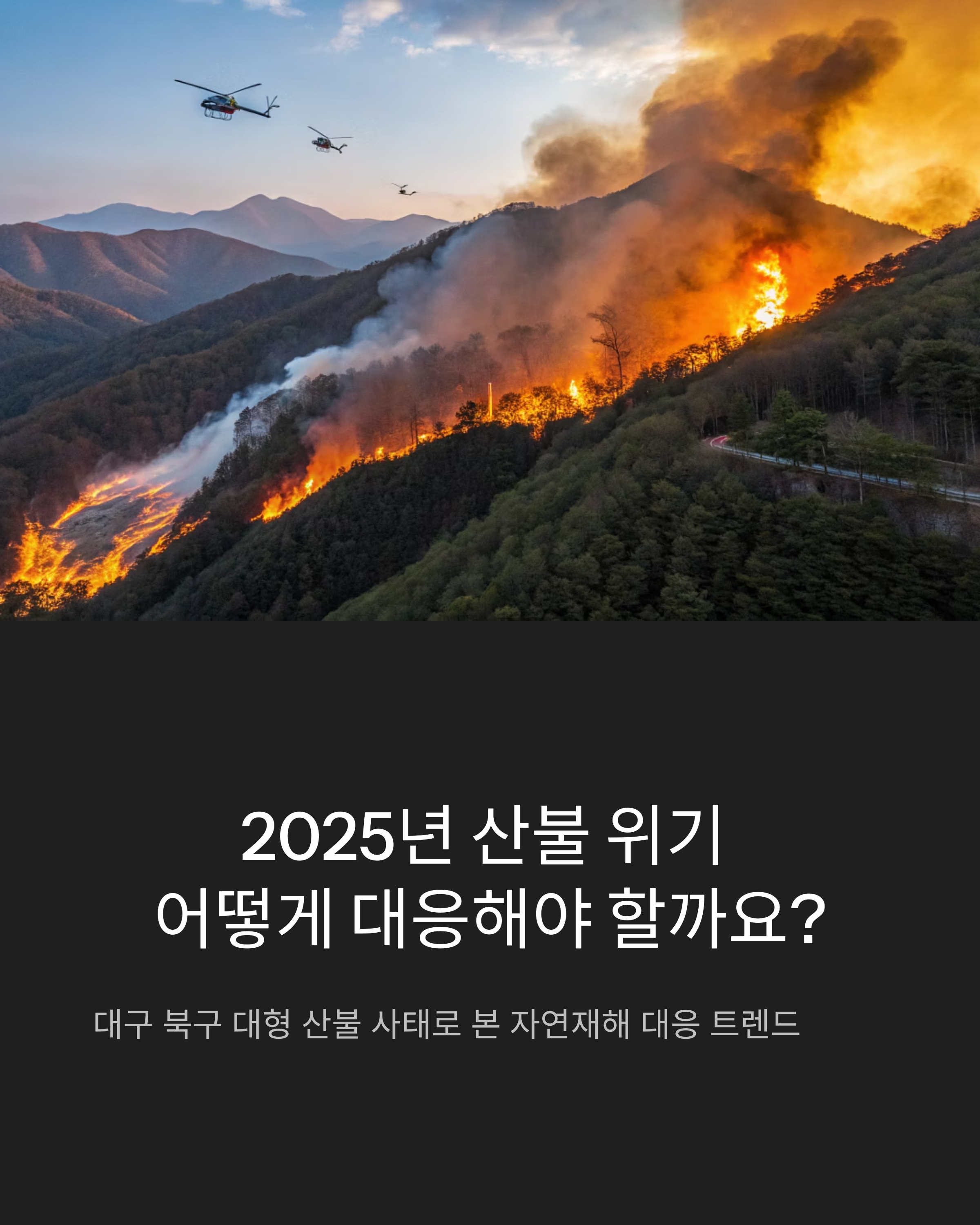 안녕하세요, 여러분! 요즘 뉴스 보셨나요? 대구 북구에서 발생한 대형 산불 소식이 연일 이어지고 있습니다. 이틀째 이어진 산불에 대응하기 위해 오늘 아침 일찍부터 진화 헬기가 다시 투입되었다고 해요. 저도 오늘 아침 뉴스 들으며 깜짝 놀랐거든요. 요즘처럼 건조한 봄철, 산불 위험성이 얼마나 높은지 다시금 실감하게 됩니다. 그래서 오늘은 '2025년 자연재해 대응 트렌드'를 중심으로, 이번 대구 북구 산불을 통해 우리가 꼭 알아야 할 내용들을 정리해보려 합니다.