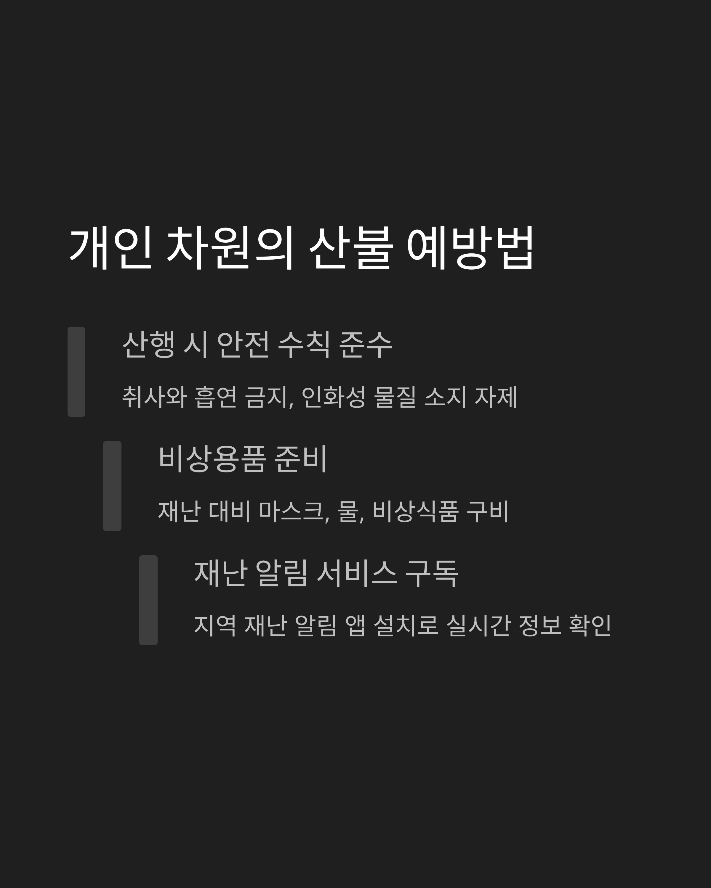 야외 흡연 금지, 불씨 완전 소화, 쓰레기 소각 금지 등 작은 실천이 대형 산불을 막는 데 큰 역할을 합니다.