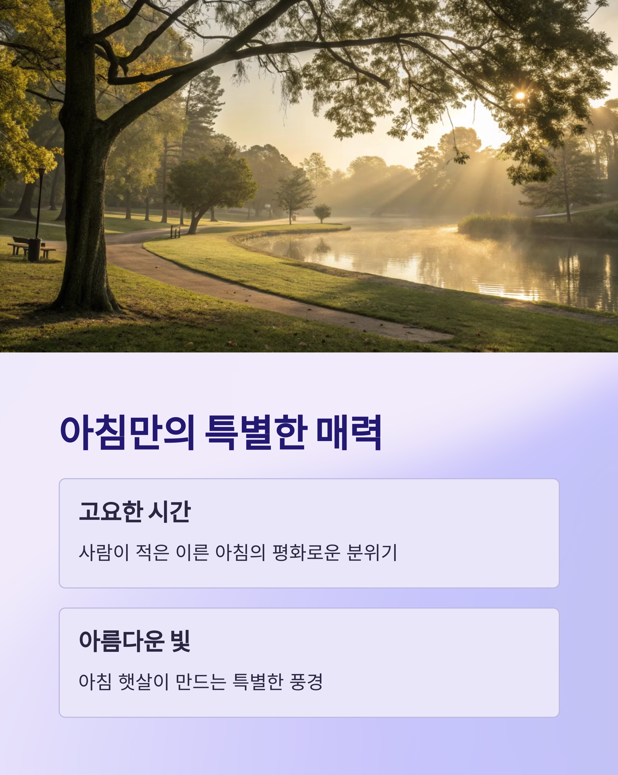 | 07:00~08:00 | 햇살이 반짝이는 수면 | 산책객 증가, 여유로운 분위기 |