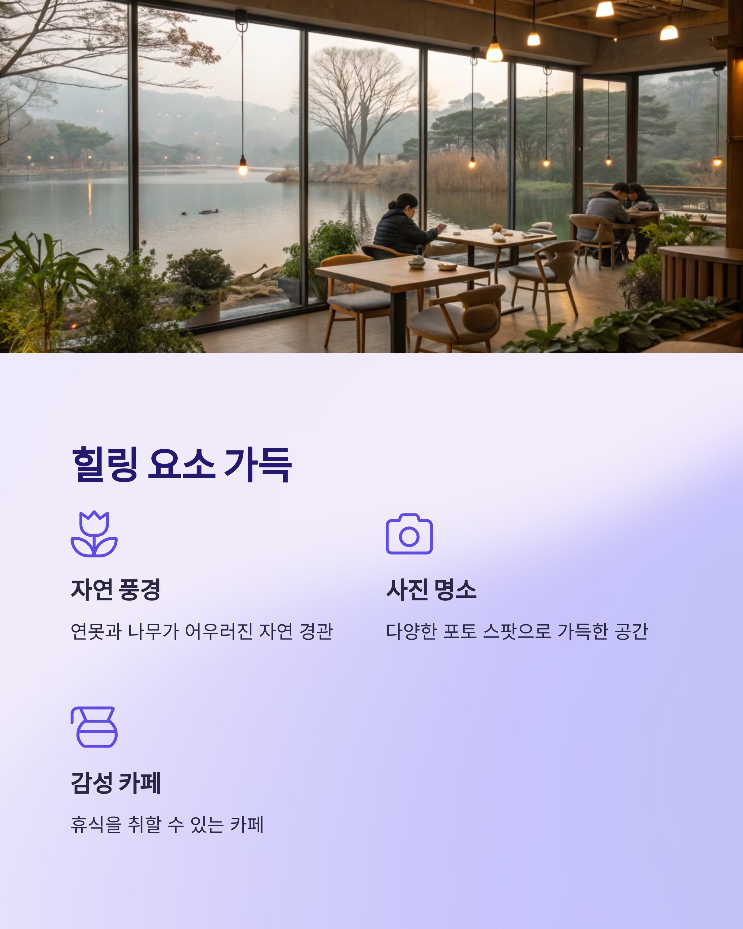 | 옥연카페 | 핸드드립 커피, 플랫화이트 | 통창으로 보이는 연못 뷰 |