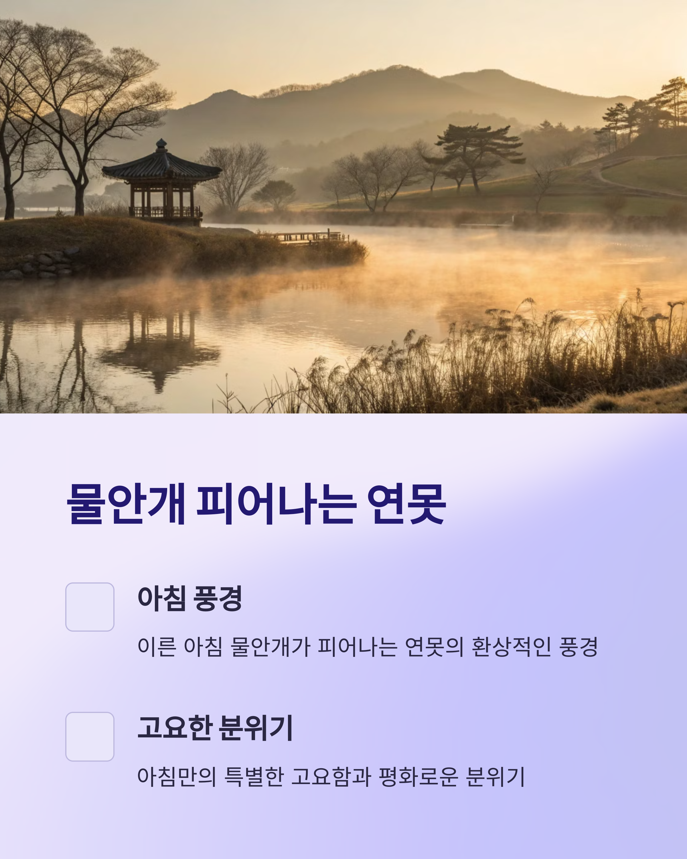 | 06:00~07:00 | 물안개 피어나는 연못 | 고요함 + 청량한 공기 |