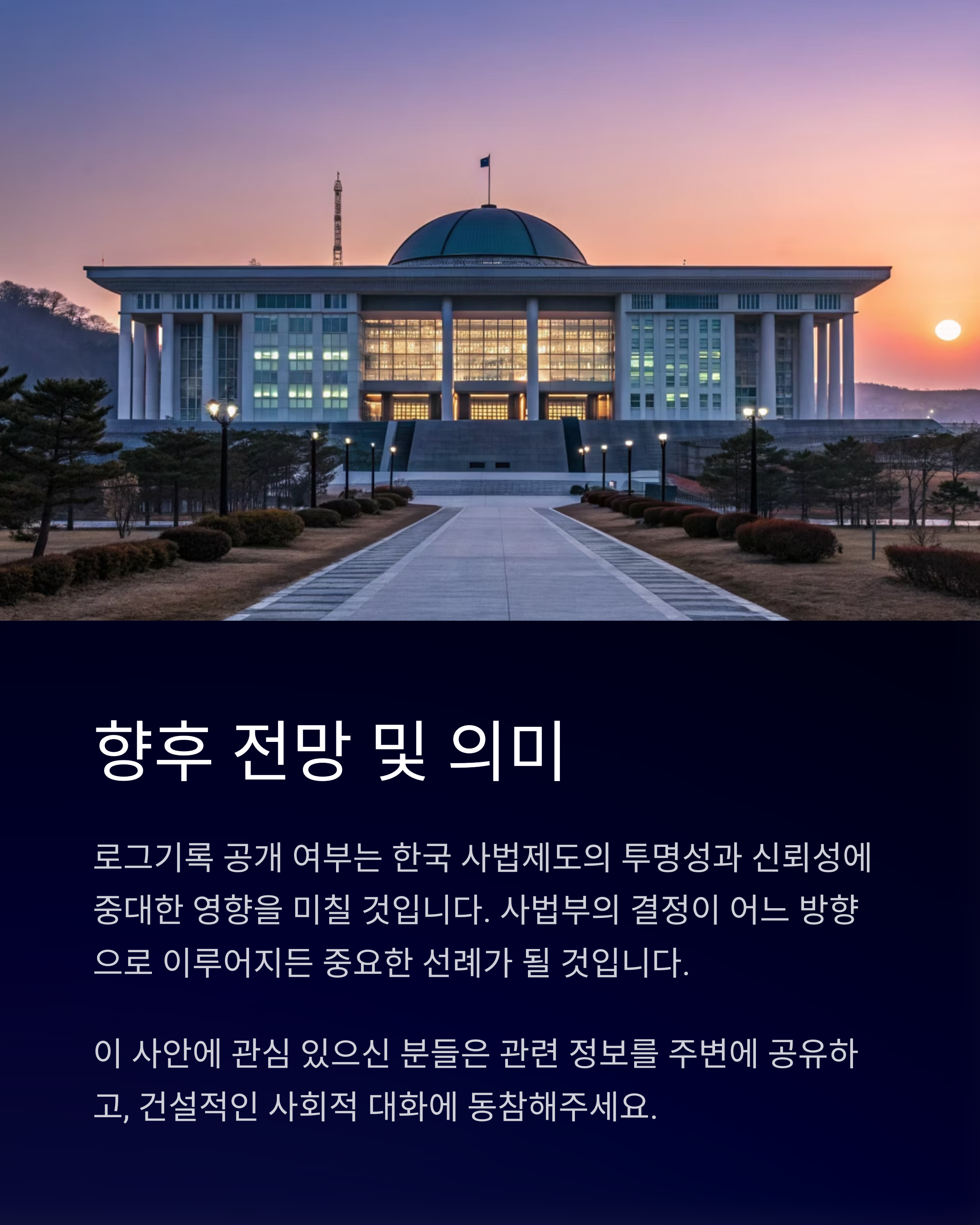 이번 로그기록 공개 요구와 100만인 서명운동은 단지 특정 정치 사건에 대한 반응이 아닙니다. 그것은 국민이 사법부를 향해 신뢰와 투명성, 그리고 시대에 맞는 개혁을 요구하는 강한 메시지입니다. 우리 모두가 이 변화의 흐름을 주목하고, 스스로 판단하고, 행동할 수 있어야 합니다. 앞으로 어떤 변화가 생길지 계속 주시하면서, 사법 시스템의 발전 방향에 대해 꾸준히 관심을 가져주시길 바랍니다.