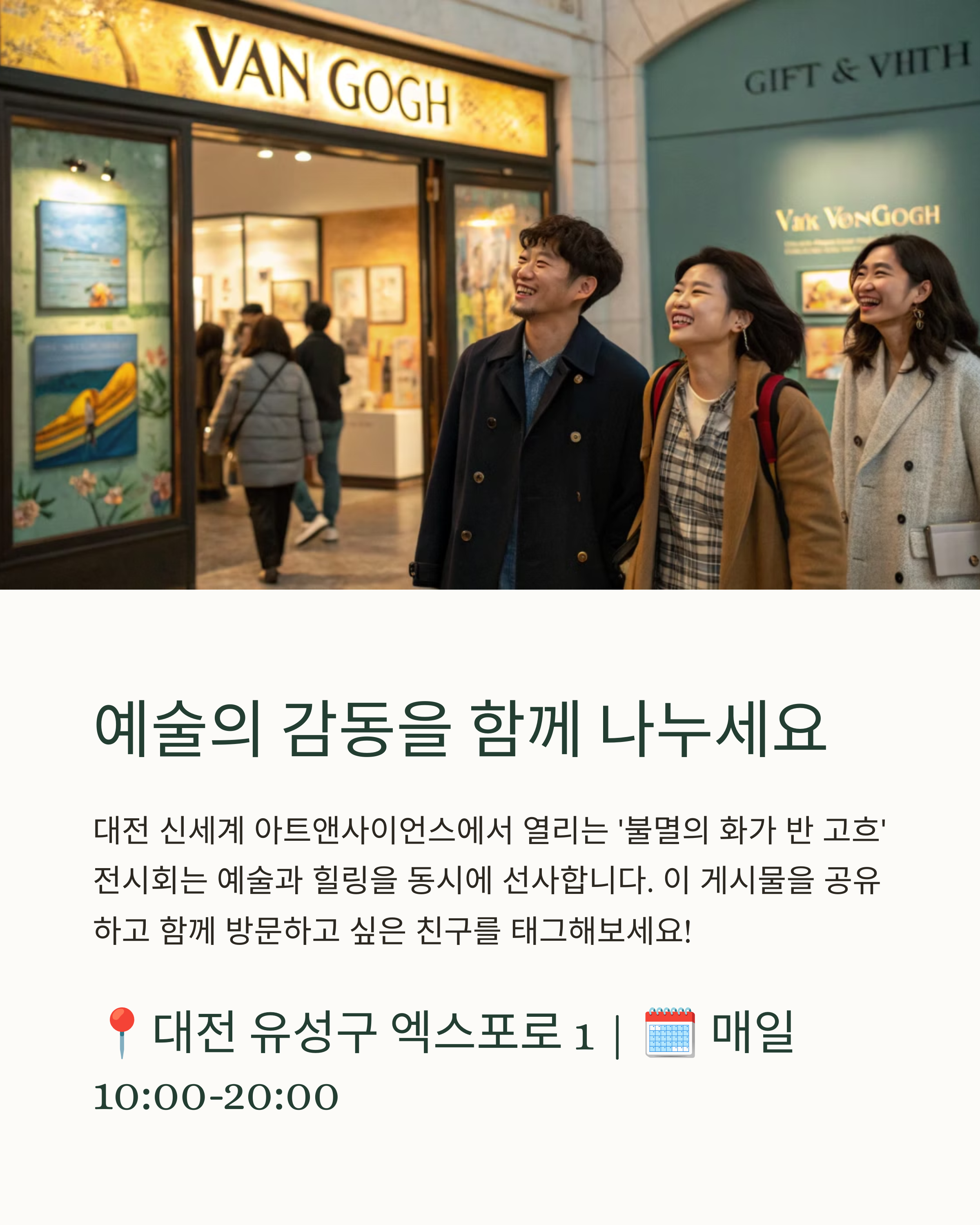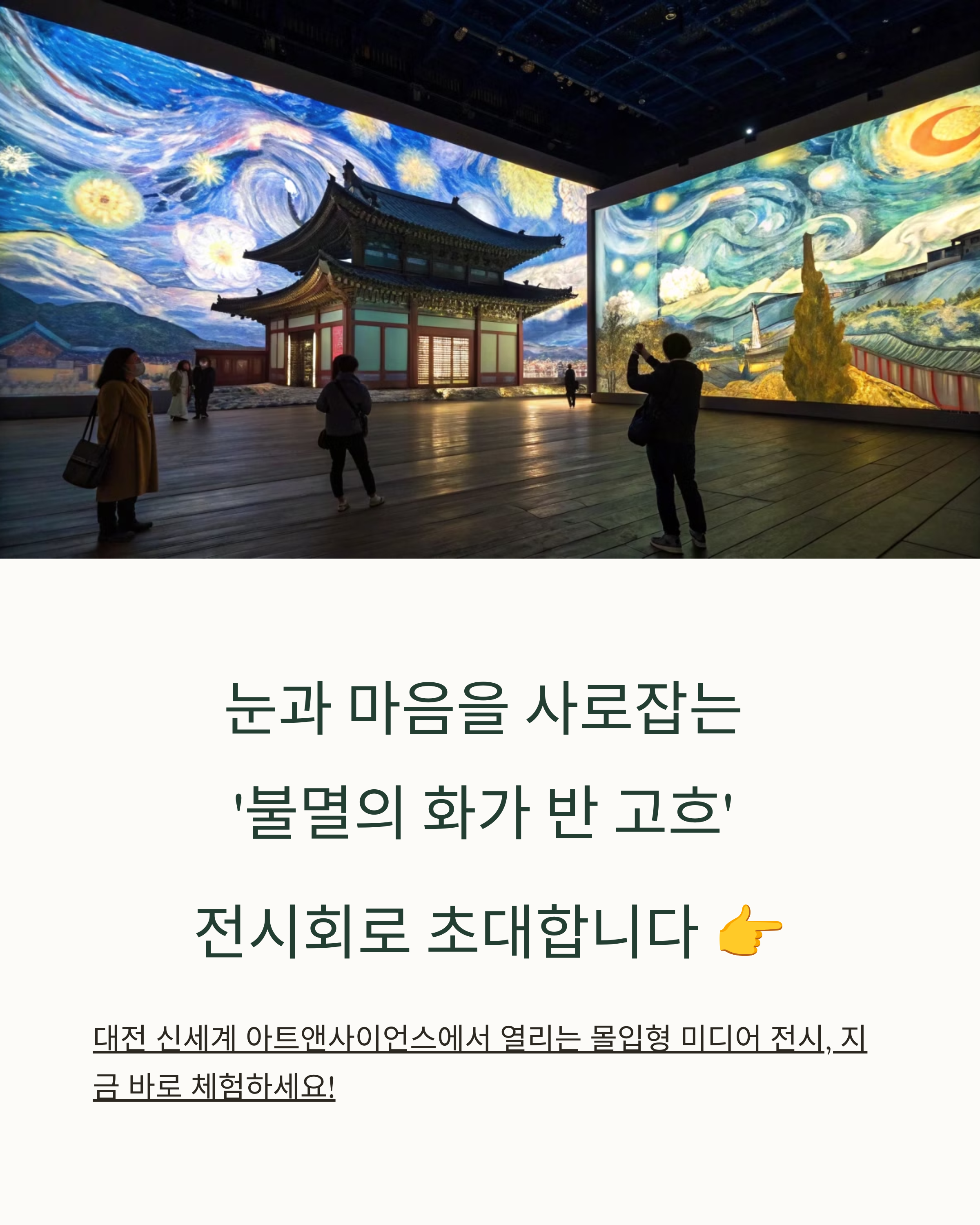지난주 친구랑 대전 갔다가 우연히 ‘불멸의 화가 반 고흐’ 전시회 포스터를 봤어요. 그냥 지나치려다 할인 이벤트가 있다는 말에 혹해서 예매했는데요, 세상에! 그 감동이 아직도 생생해요. 고흐 특유의 강렬한 색감이 스크린과 공간 속에 퍼져나가고, 몰입형 영상으로 꾸며진 전시장은 마치 그림 안에 들어간 기분이더라구요. 혹시 아직도 ‘대전에서 그런 걸 해?’ 하시는 분들 계시다면, 오늘 이 글 꼭 읽어보세요. 전시 정보부터 할인 팁까지 꼼꼼히 알려드릴게요!
