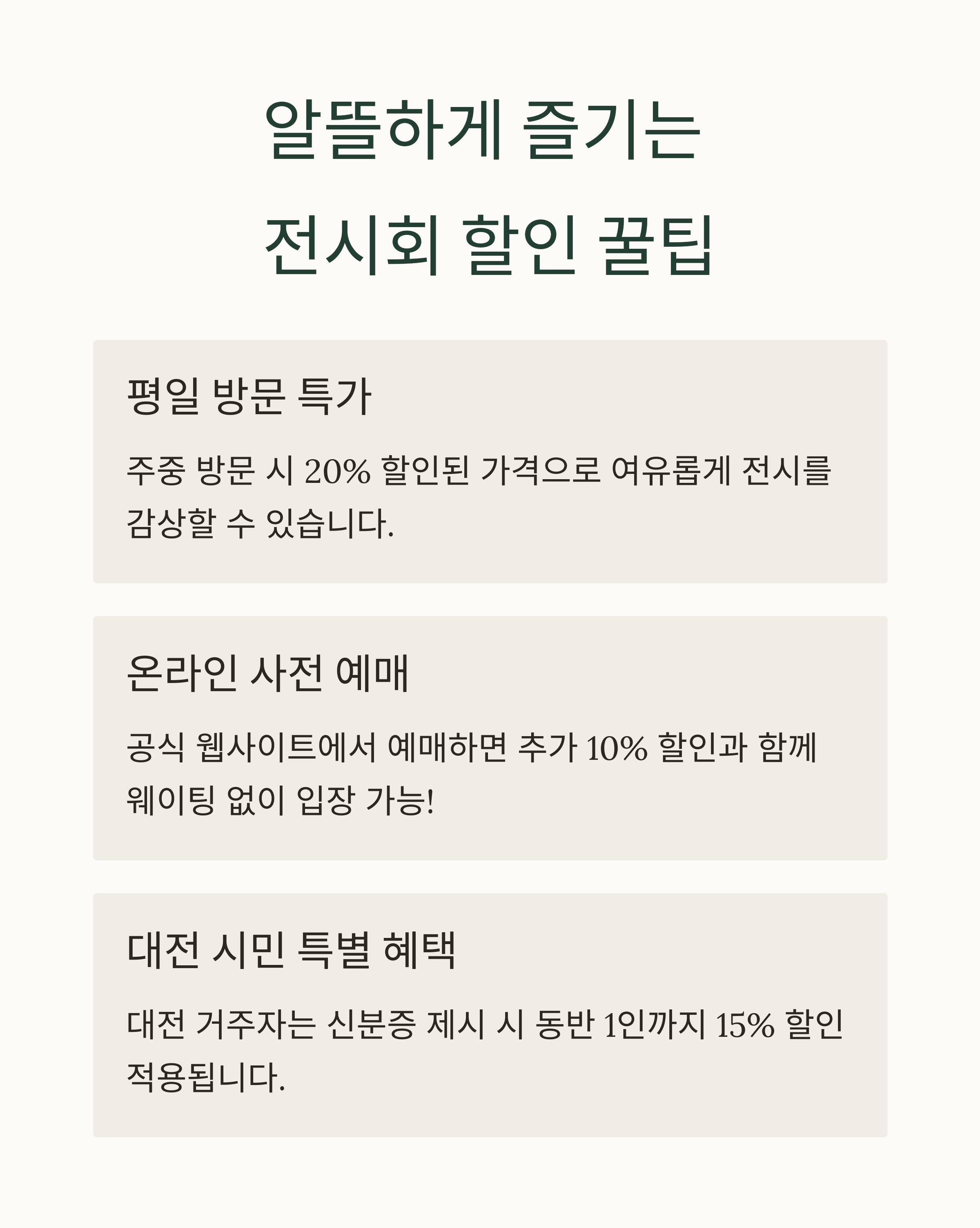 술가의 내면과 시간을 함께 걷는 느낌이 들었달까요? 특히 대전처럼 쉽게 접근할 수 있는 도심 한복판에서 이런 수준 높은 전시를 경험할 수 있다는 건 정말 반가운 일이에요. 할인 정보까지 챙기면 더없이 알찬 예술 나들이가 되겠죠? 이번 주말, 반 고흐의 빛과 색을 직접 느껴보는 건 어떠세요?
