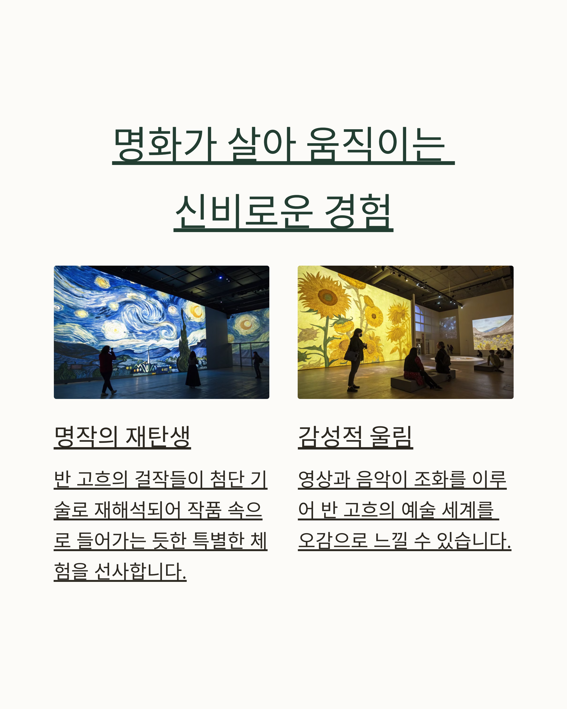 ‘불멸의 화가 반 고흐’ 전시회는 세계적인 거장 반 고흐의 작품 세계를 몰입형 공간으로 구현한 전시입니다. 캔버스 위의 정적인 그림을 넘어, 영상·음악·조명 기술이 어우러져 마치 그림 속에 들어간 듯한 체험이 가능하죠. ‘별이 빛나는 밤에’, ‘해바라기’, ‘자화상’ 등 대표작들을 고화질 디지털 아트로 재해석하여 전시장 전체에 투사해 관람객들이 감각적으로 고흐의 세계를 느낄 수 있게 구성되어 있어요. 단순 감상이 아닌 ‘경험하는 전시’라는 점이 가장 큰 특징입니다.