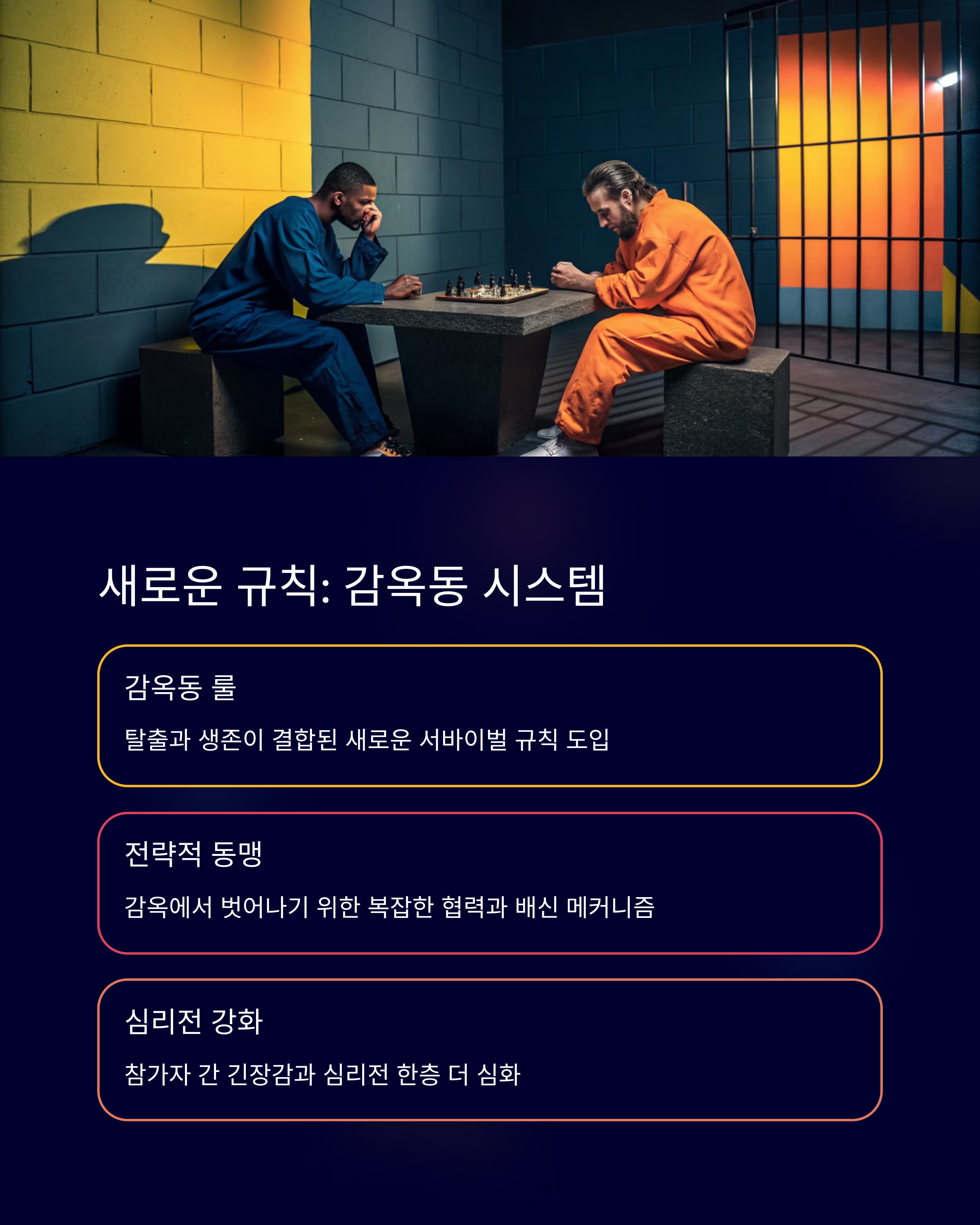 이번 시즌에서 가장 큰 변화는 '감옥동'이라는 구조의 도입입니다. 이는 플레이어 간의 정보 차단과 심리 압박을 강화하는 시스템으로, 게임의 긴장감을 극대화합니다. 전략적 변화 요약은 다음과 같습니다: