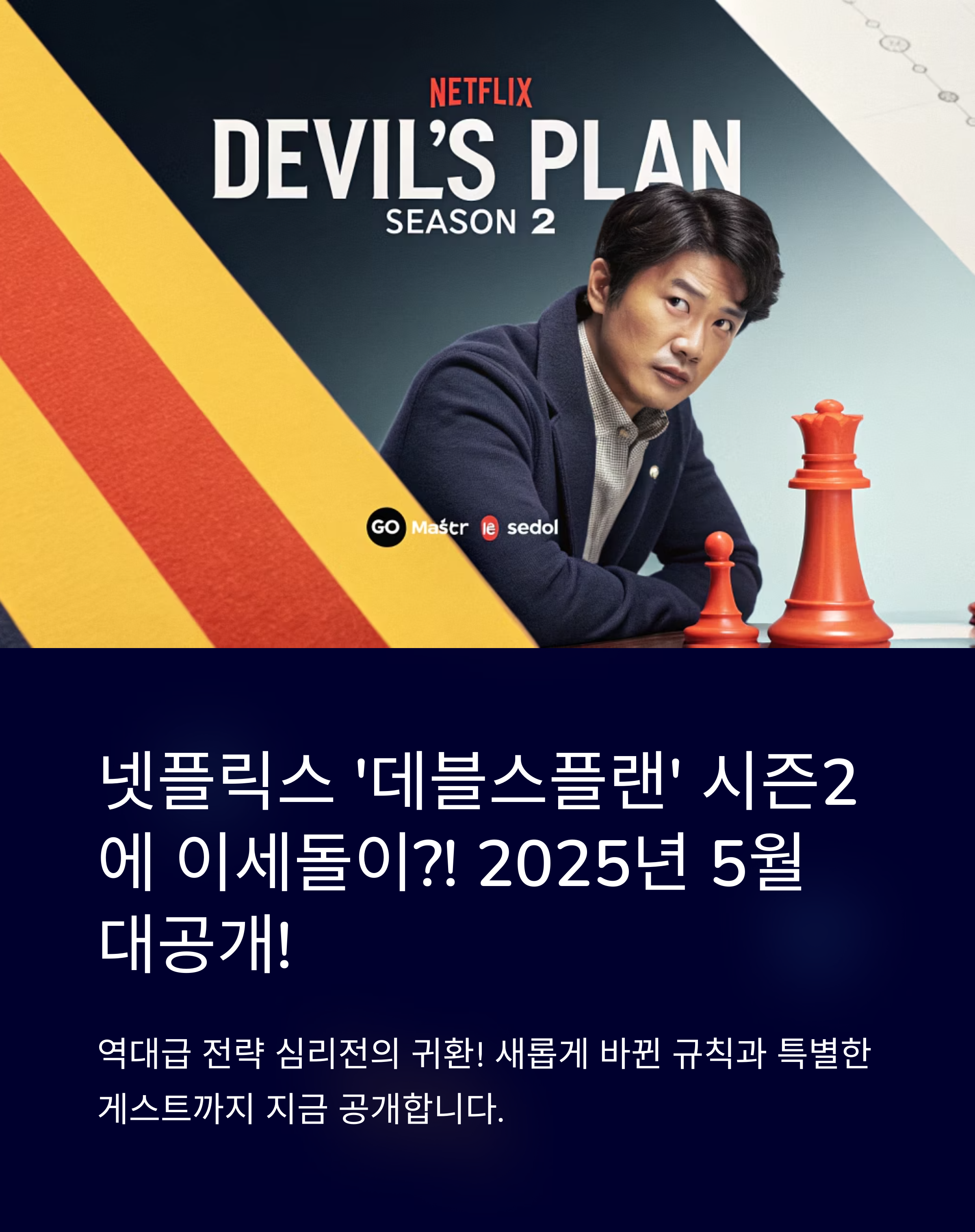 2025년 5월 첫째 주 넷플릭스의 주요 신작 중 단연 화제는 ‘데블스플랜 시즌2’입니다. 시즌1의 성공에 힘입어 시즌2는 더 큰 스케일과 정교한 게임 룰을 선보이며 시청자들을 사로잡고 있습니다. 특히, 전설의 바둑기사 이세돌의 출연이 주목을 끌며 “두뇌게임의 진수”라는 평을 받고 있죠.