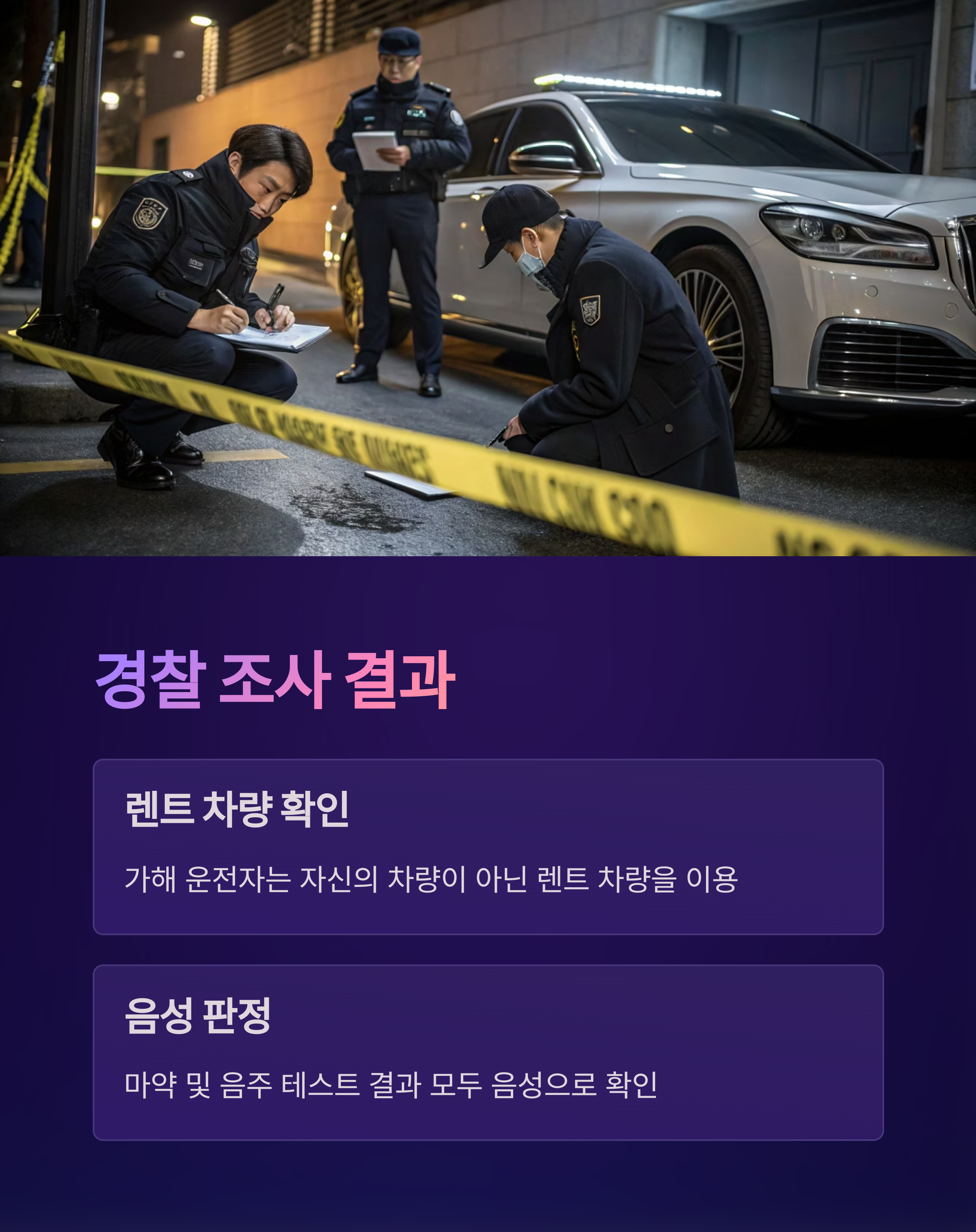 서울경찰청은 사건 당일 긴급 체포된 운전자는 30대 남성으로, 음주 및 마약 간이검사에서 모두 음성 판정을 받았다고 발표했습니다. 그러나 경찰은 “운전자의 정신 상태에 문제가 있었던 것으로 추정된다”며 정신감정 및 범행 동기 파악을 위한 심층 조사를 예고했습니다. 또한 벤츠 차량은 운전자 본인 명의가 아닌렌트 명의로 확인되었으며, 차량 소유주와의 관계도 조사 중입니다.