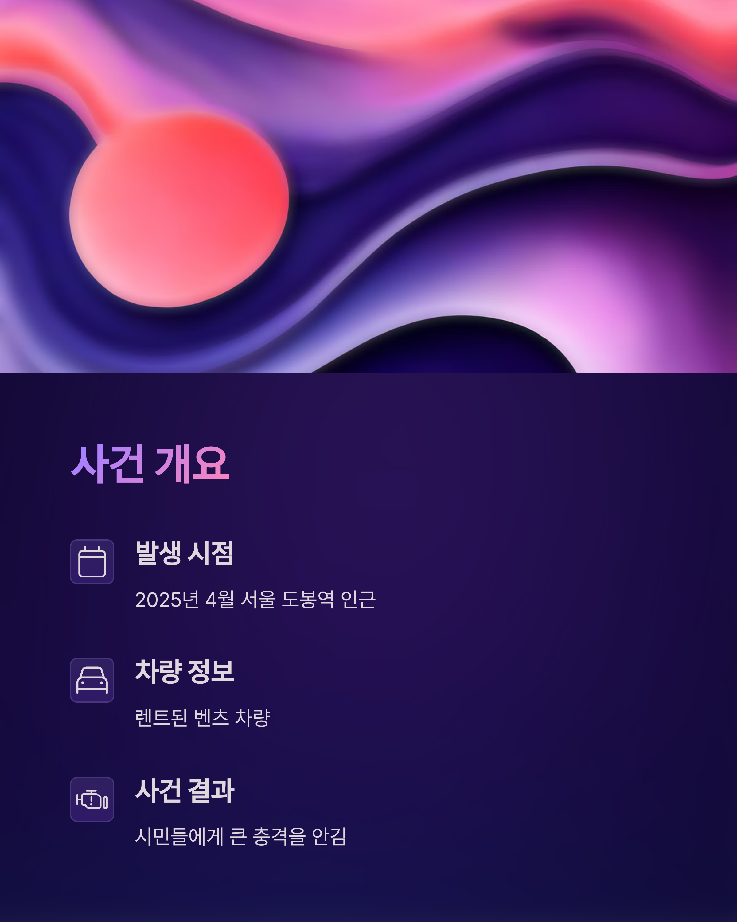 도봉역 사건은 예외적인 일이 아니었습니다. 최근 몇 년간 비슷한 차량 난동 사건이 증가하고 있는데요. 아래 표는 최근 3년간 발생한 유사 유형 사건들을 요약한 것입니다.