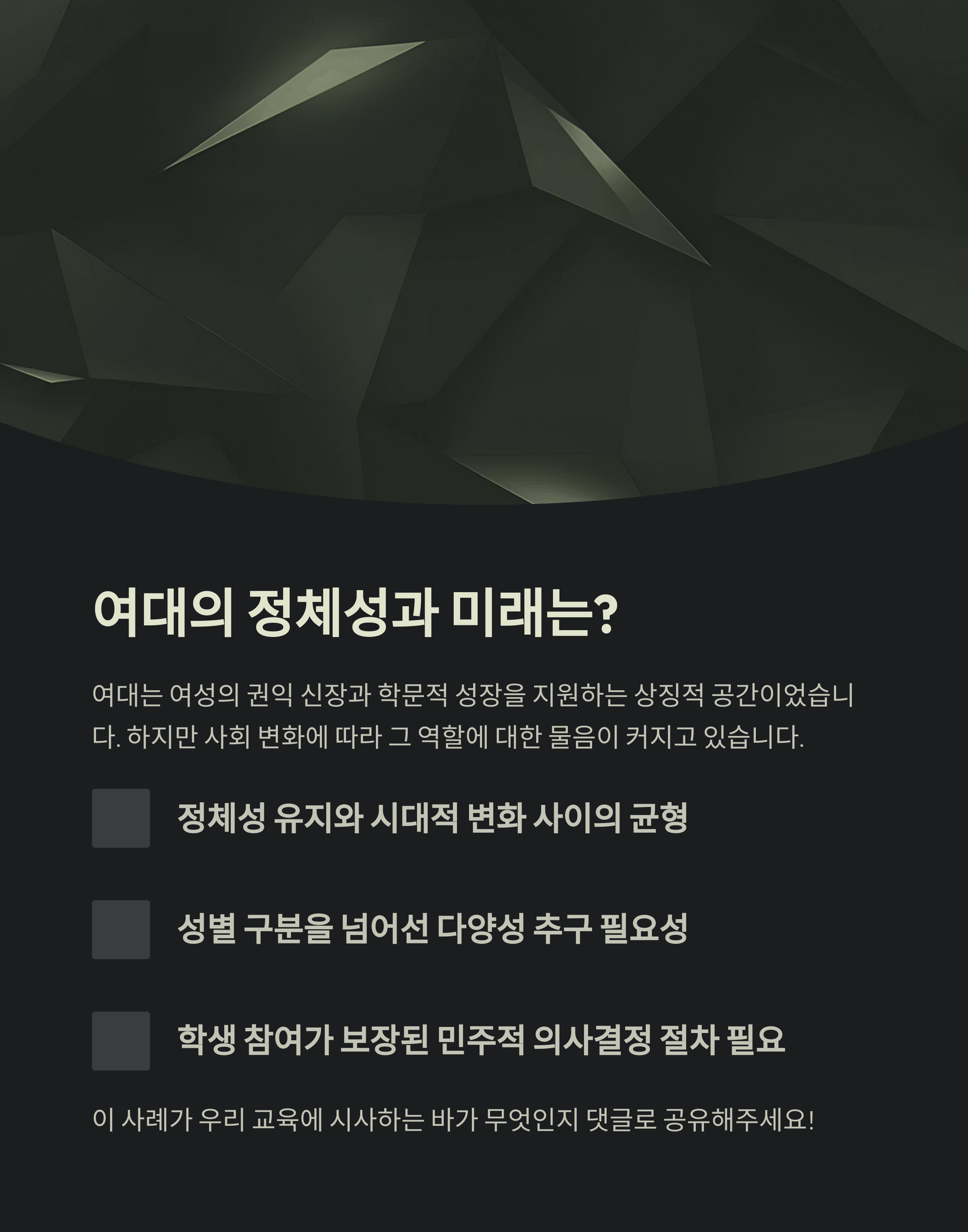 여대는 여성의 권익 신장과 학문적 성장을 지원하는 상징적 공간이었습니다. 하지만 사회가 바뀌고, 여성의 사회 진출이 확대되며 그 역할에 대한 물음이 커지고 있습니다.