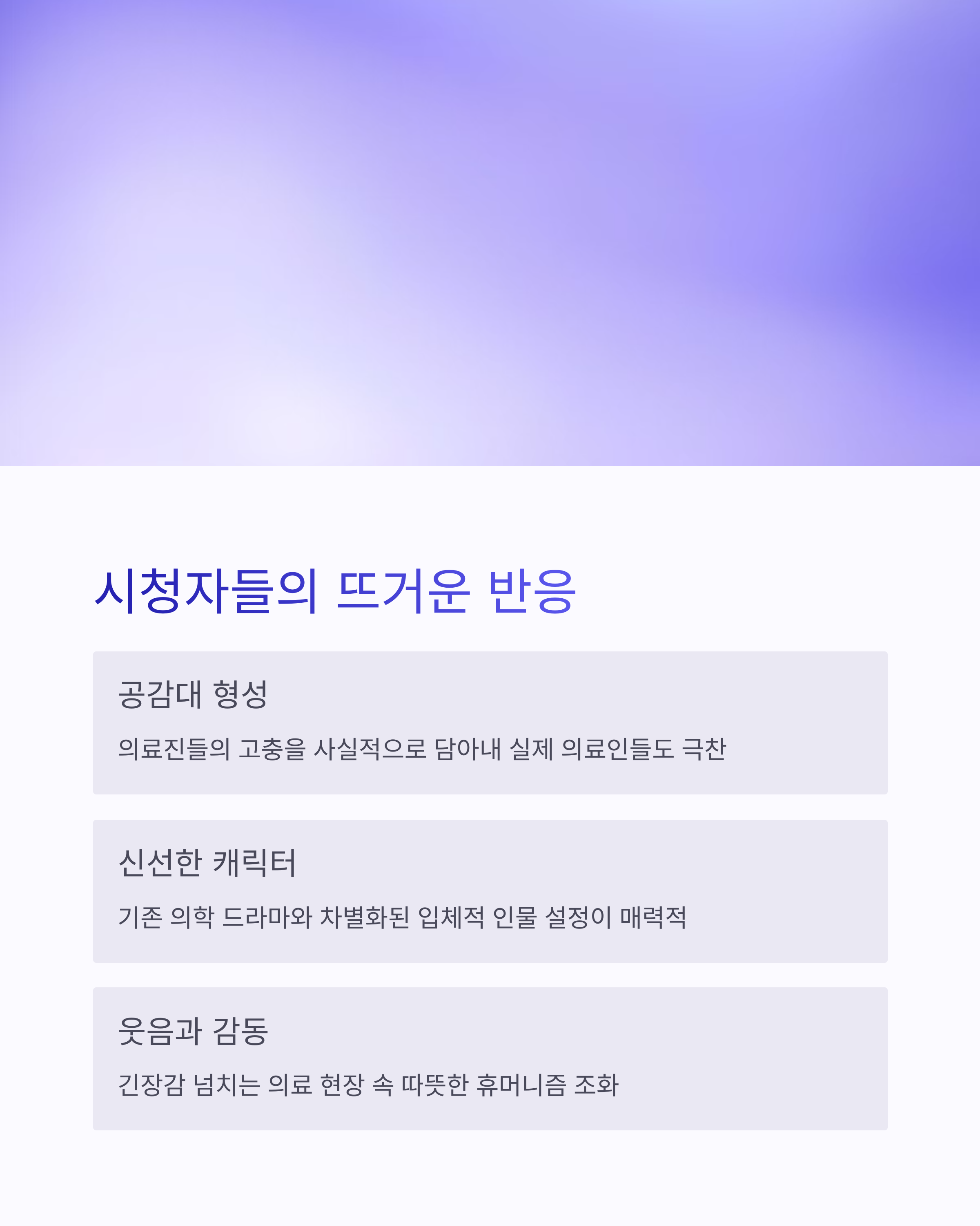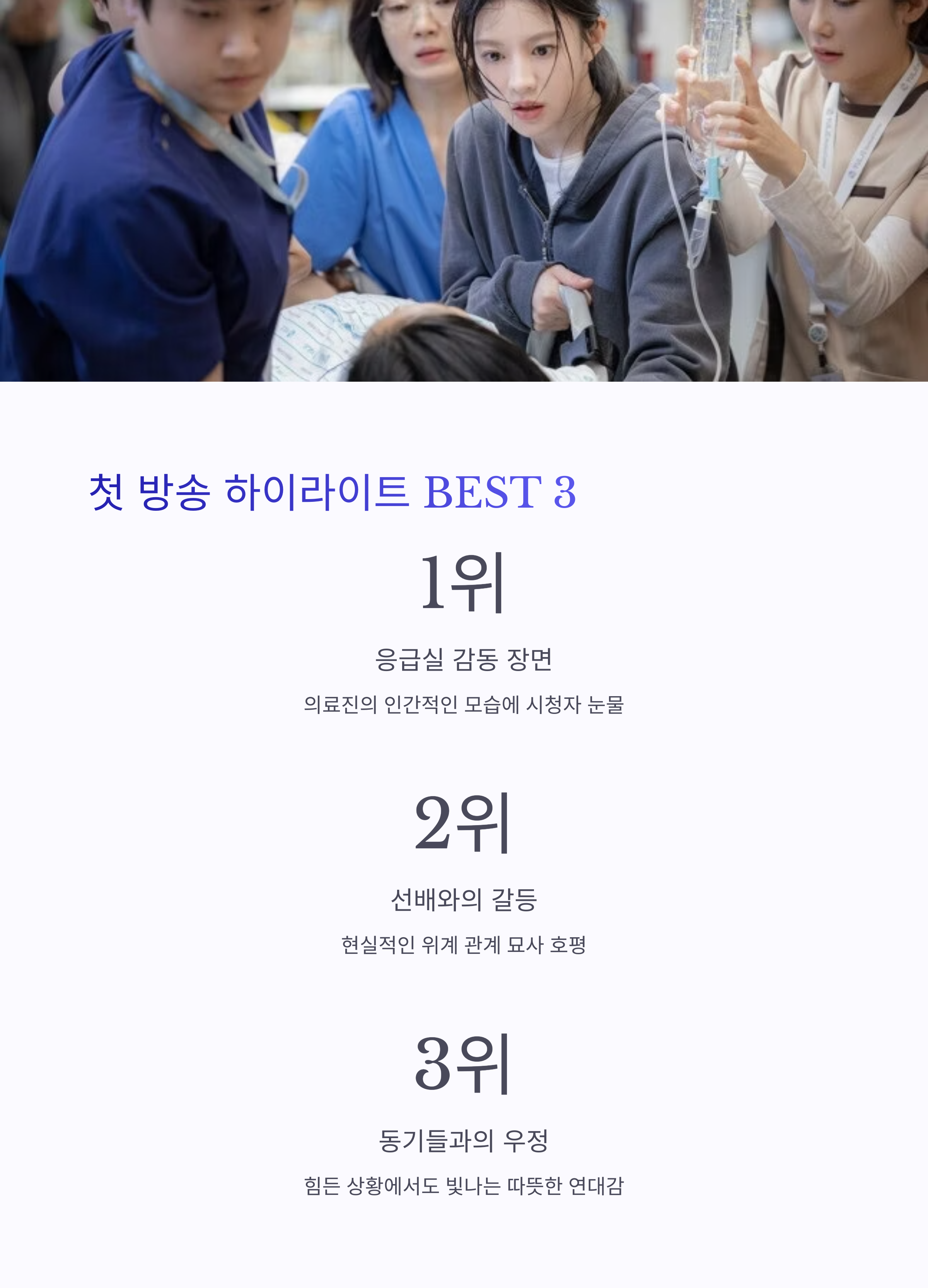 앞으로 이 청춘들이 어떤 이야기를 만들어갈지, 어떤 환자들과 어떤 선택을 마주할지 기대되시죠? 저는 매주 본방 사수 예정입니다! 💜 다음 리뷰에서는 2화 속 감정 폭발 장면과 제작 비하인드도 소개해드릴게요!
