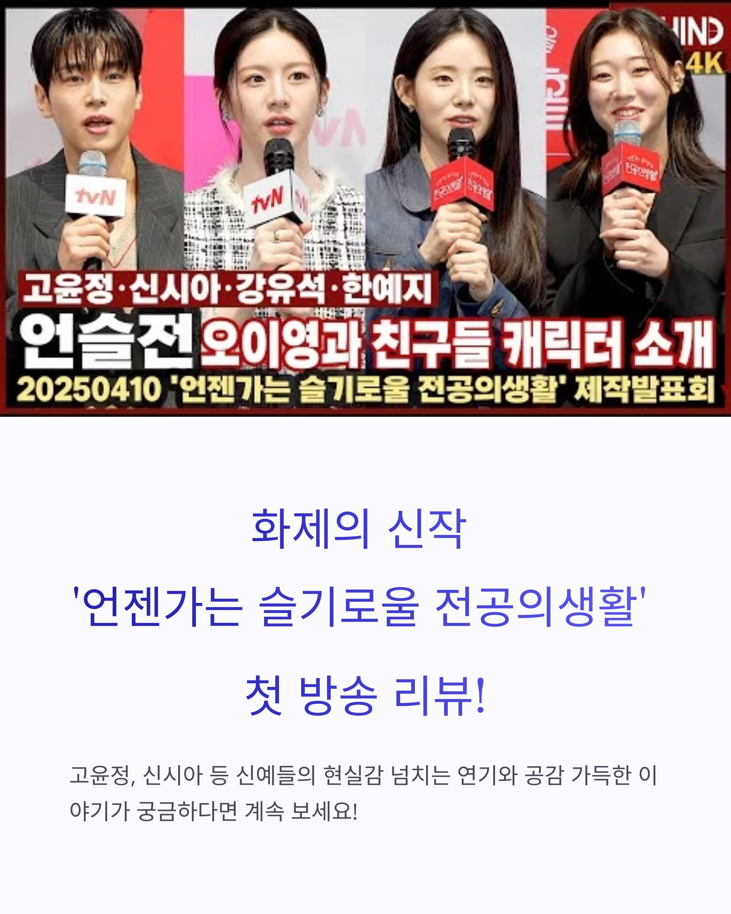 ‘언젠가는 슬기로울 전공의생활’은 단순한 의학드라마를 넘어, 청춘들의 성장과 인간 관계의 온기를 담아낸 작품이었어요. 특히 고윤정과 신시아의 존재감은 첫 회만으로도 충분히 느껴졌고, 다음 회가 기다려지는 드라마는 오랜만인 것 같아요.
