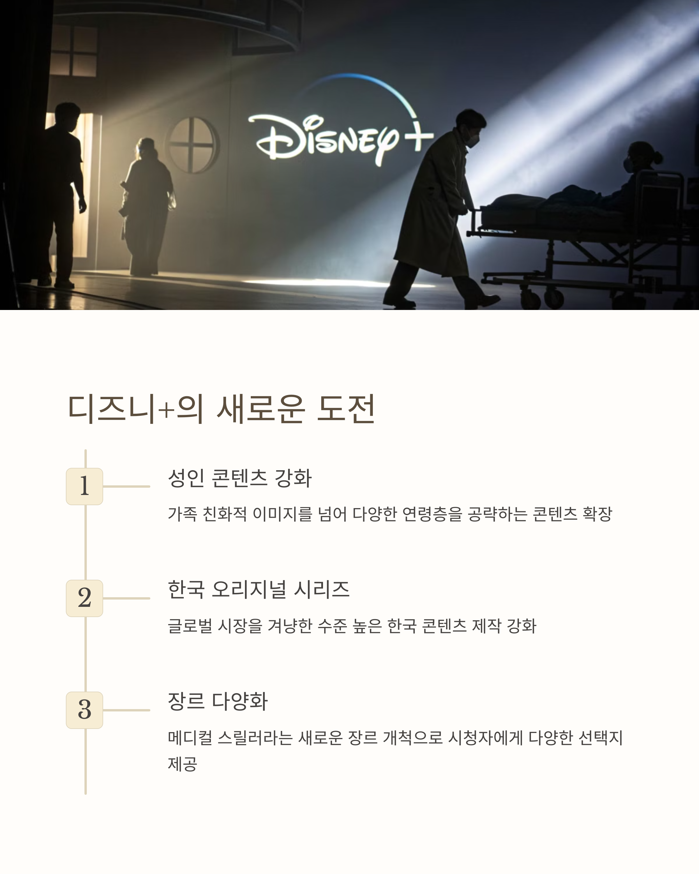 디즈니+는 다양한 연령층을 타깃으로 하는 콘텐츠를 확장하기 위해 성인 시청자를 겨냥한 작품을 적극적으로 제작하고 있습니다.