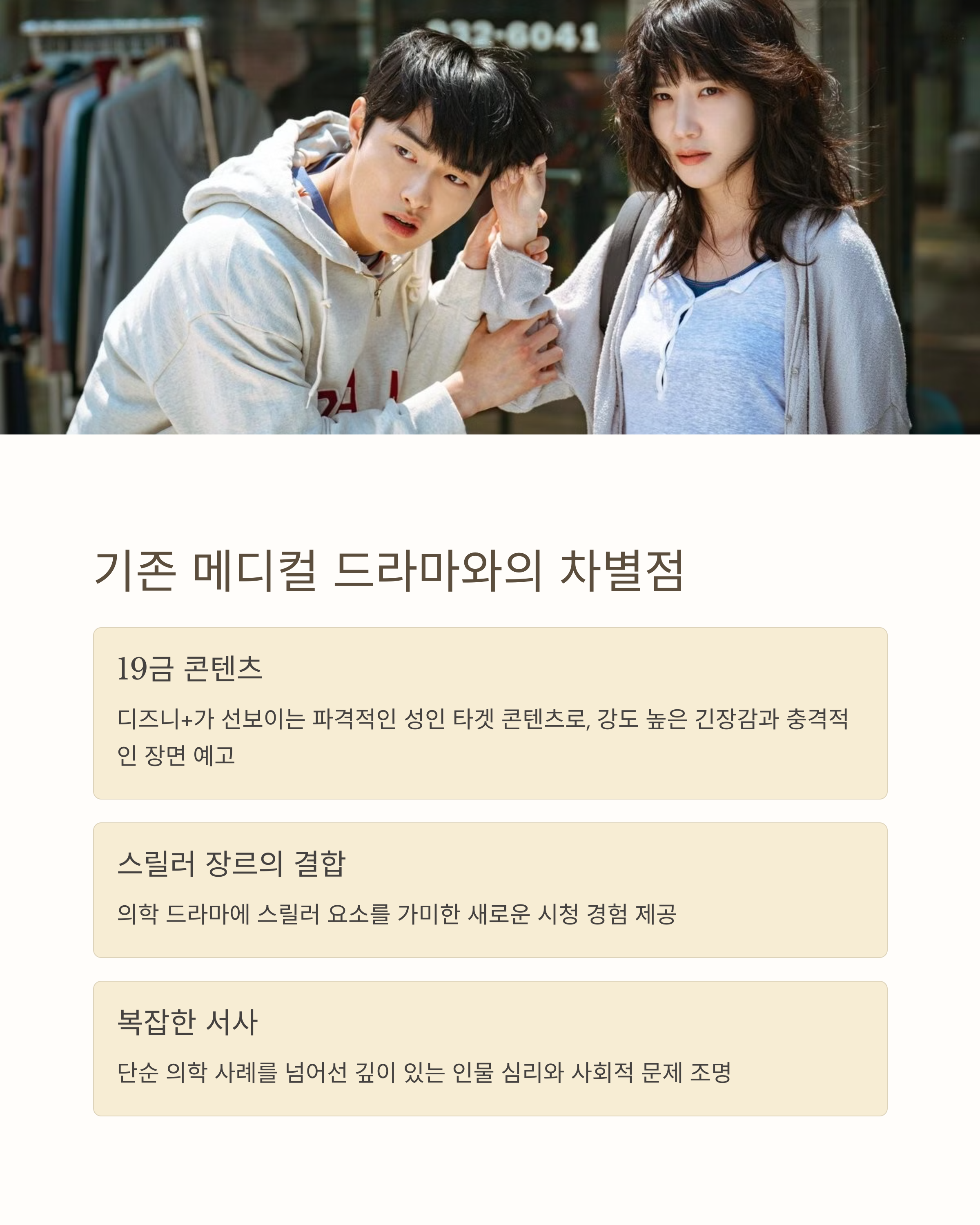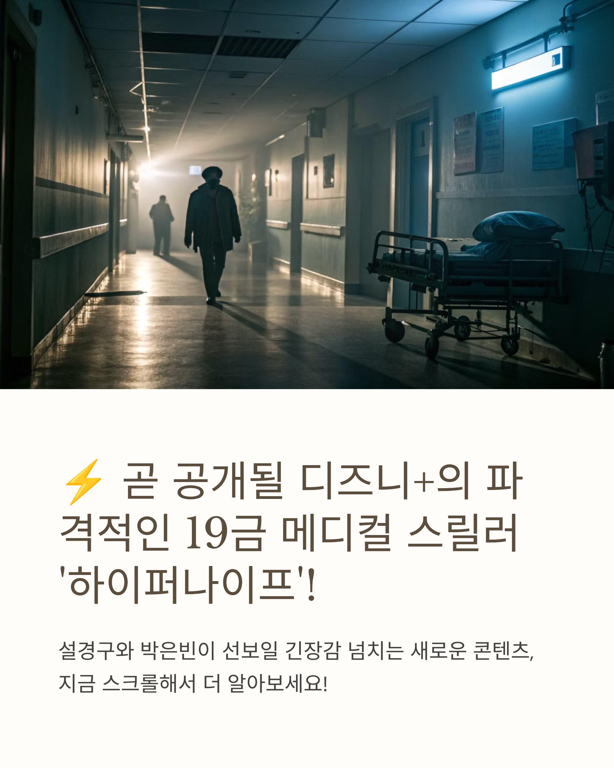 디즈니+에서 새롭게 선보이는 '하이퍼나이프'는 메디컬 스릴러 장르의 드라마로, 의학적 지식과 스릴러 요소가 결합된 긴장감 넘치는 스토리가 특징입니다. 특히, 국내외에서 인정받는 배우 설경구와 박은빈이 주연을 맡아 더욱 기대를 모으고 있습니다. 디즈니+가 기존의 가족 친화적인 콘텐츠에서 벗어나 19금 등급의 강렬한 서사를 선보인다는 점도 주목할 만한 포인트입니다.