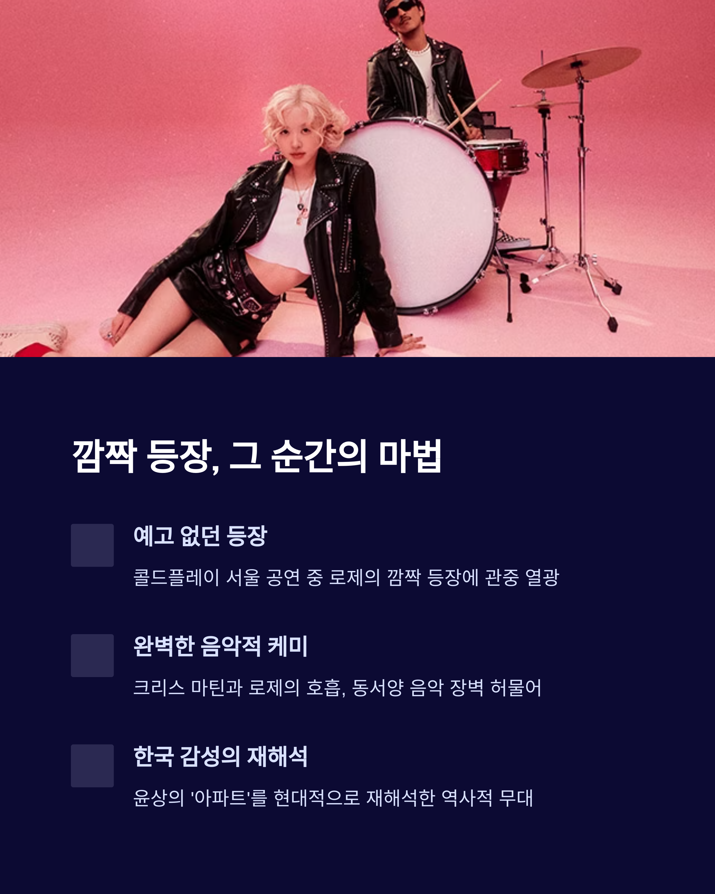 안녕하세요 여러분! 어젯밤, 서울 잠실 올림픽 주경기장은 말 그대로 ‘찢었습니다’. 콜드플레이 월드투어 서울 공연 마지막 날, 관객들도 미처 예상하지 못했던 로제의 등장이 모든 걸 뒤바꿨어요. 블랙핑크 로제가 무대 위로 올라와 크리스 마틴과 함께 윤상의 ‘아파트’를 영어+한국어 버전으로 라이브로 불렀다니까요?! SNS 실시간 검색어가 바로 뒤집힌 건 물론, 외신까지 반응 폭발! 오늘은 그 현장의 분위기, 무대 비하인드, 음악적 의미까지 다뤄볼게요.