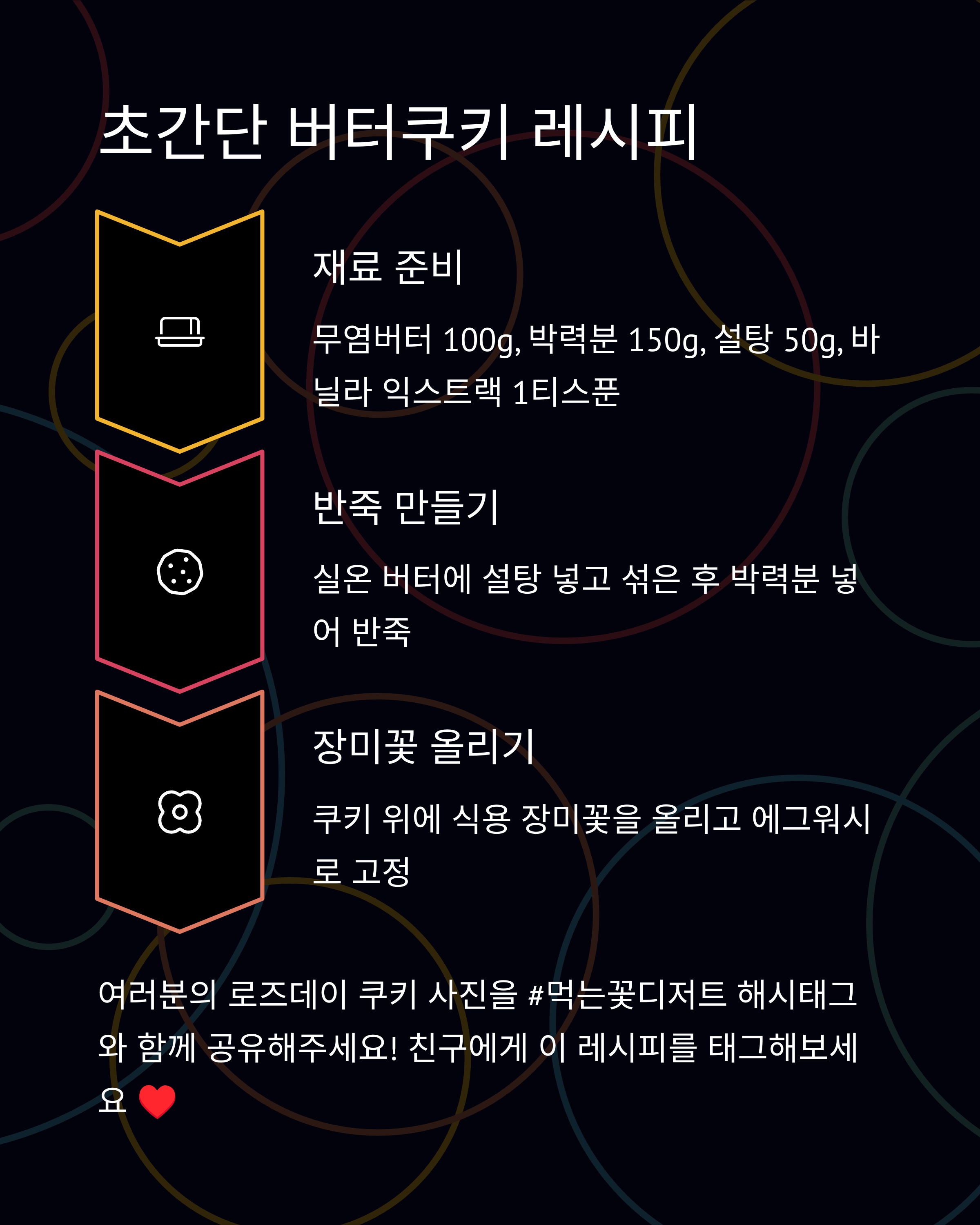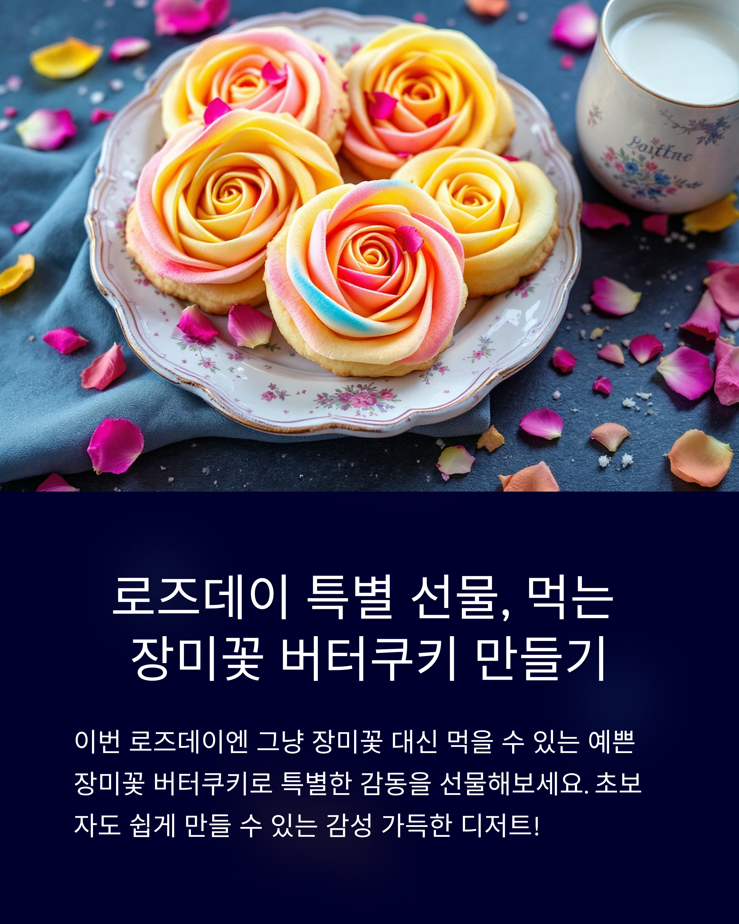 안녕하세요! 제가 요즘 푹 빠진 취미가 바로 홈베이킹인데요, 다가오는 로즈데이를 맞아 특별한 쿠키를 만들어봤어요. 바로, 먹는 장미꽃을 올려 만든 감성 가득한 버터쿠키! 사실 처음엔 '이걸 진짜 먹어도 되는 거야?' 싶었는데, 식용 장미꽃이란 걸 알고 나선 완전 신세계가 열렸답니다. 만들기도 너무 간단하고, 선물용으로도 완전 최고예요. 오늘은 그 레시피를 여러분과 공유해보려 해요 :)