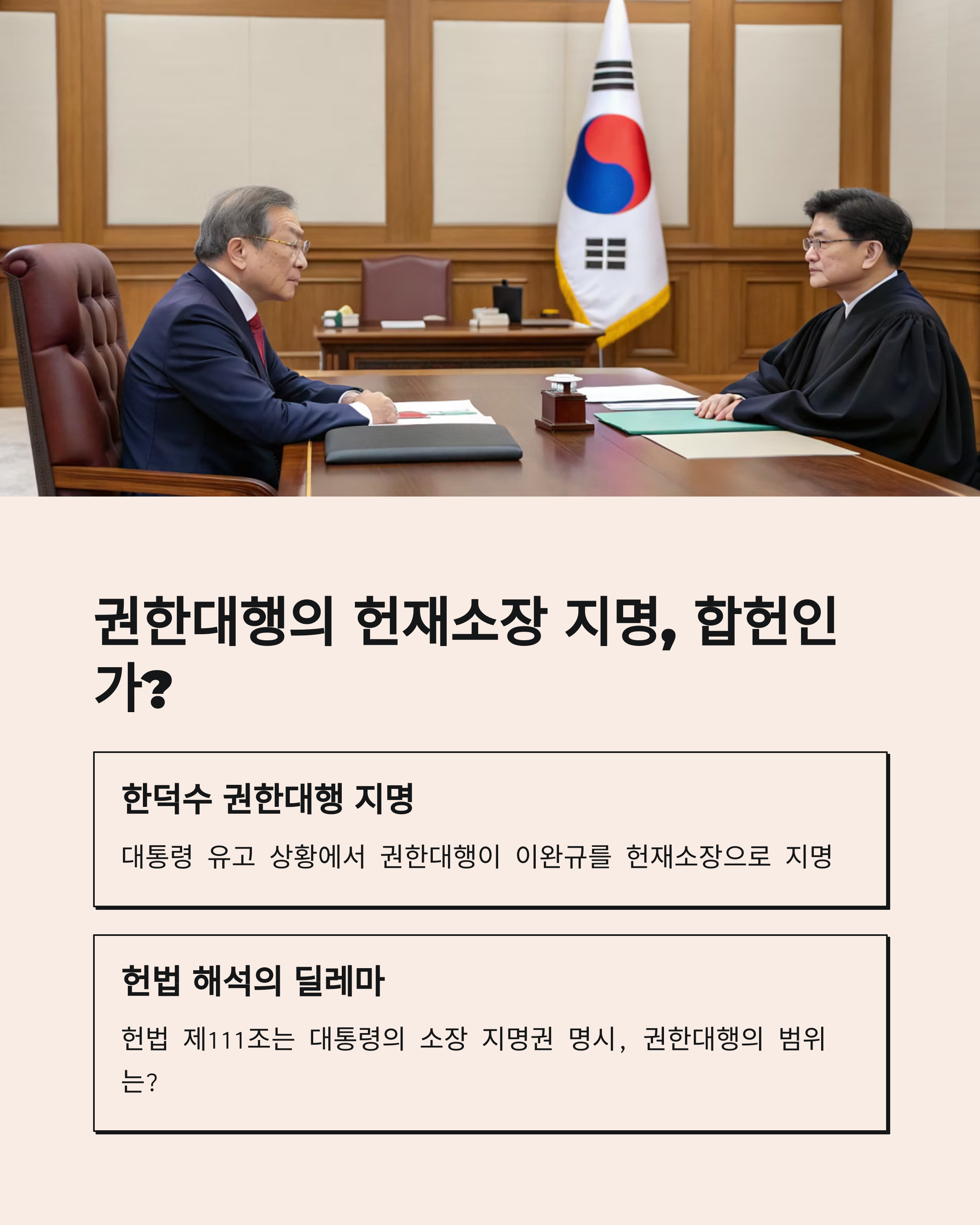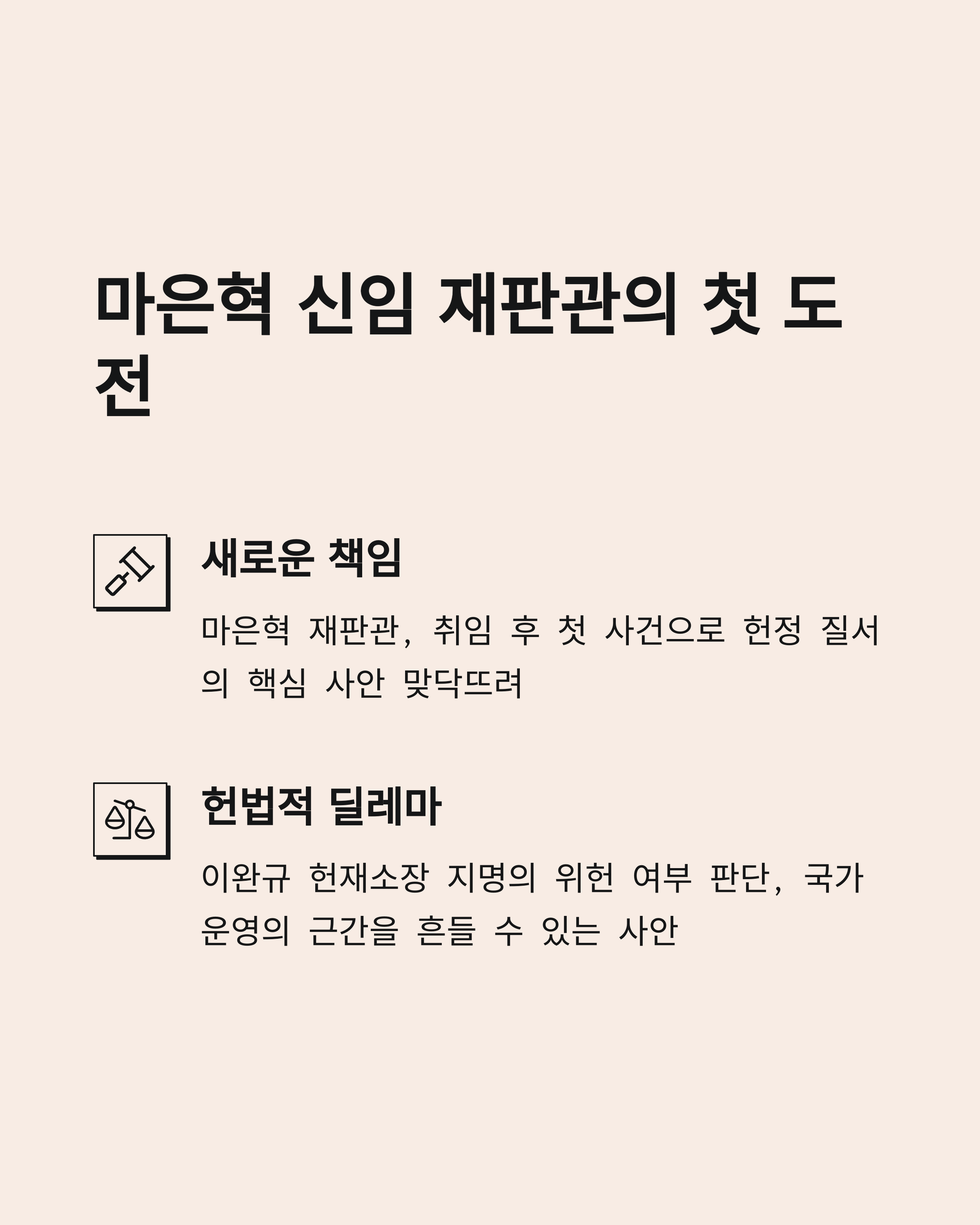 안녕하세요, 오늘은 최근 임명된 마은혁 헌법재판관의 첫 심리 사건에 대해 이야기해보려 합니다. 임명된 지 얼마 지나지 않아 헌법적 파장이 큰 사안을 맡게 됐다는 점에서 헌재 안팎으로 긴장감이 흐르고 있는데요. 바로 한덕수 국무총리 권한대행에 의한 이완규 헌법재판소장 지명 건이 그 주인공입니다. 정치적, 헌법적 쟁점이 뒤얽힌 만큼 국민적 관심도 높아지고 있고요. 이 사건의 핵심은 '총리 권한대행의 재판소장 지명이 가능한가?'라는 질문인데요. 이 글에서는 사건의 배경, 법적 쟁점, 헌재 내 시선까지 조목조목 정리해드립니다.