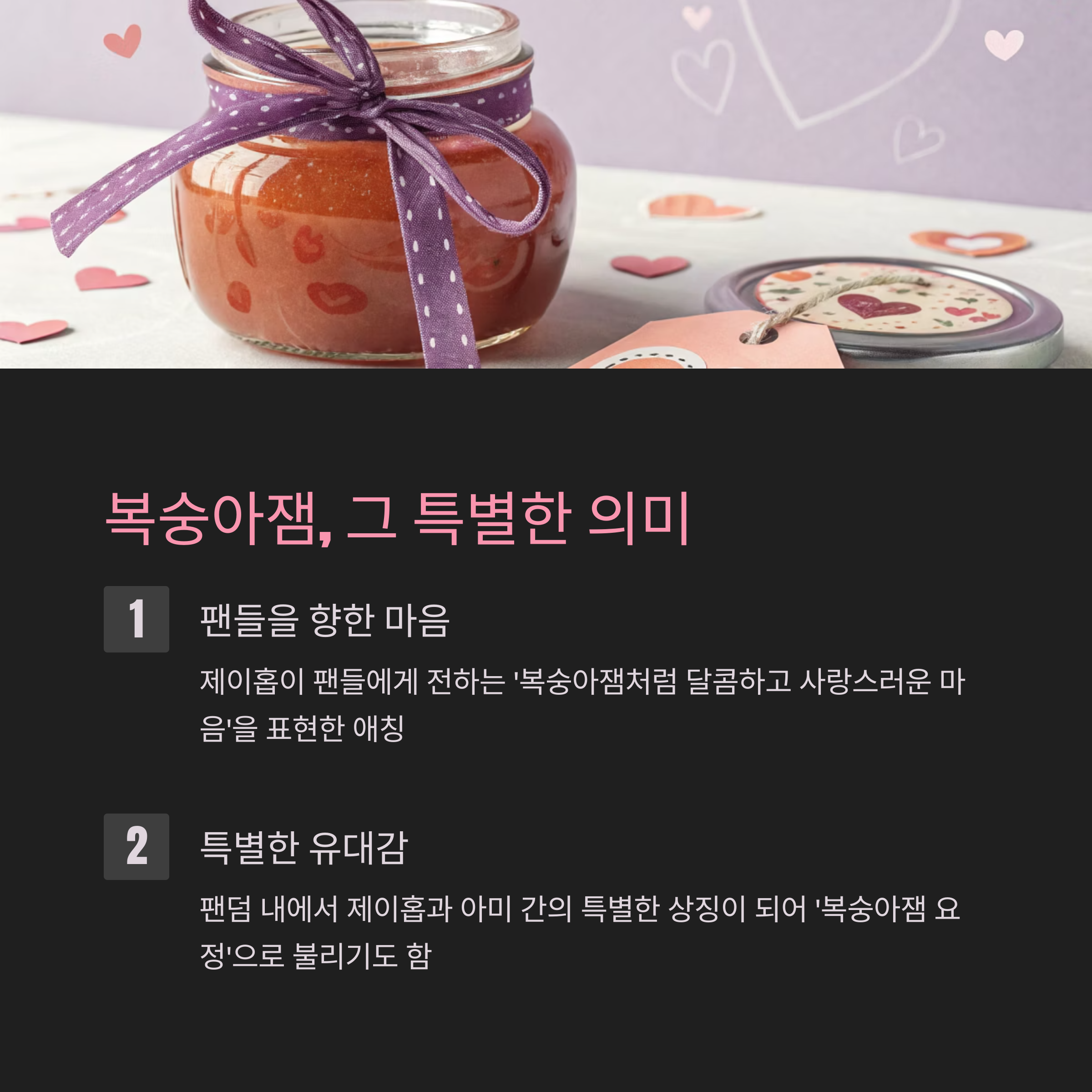 1. '제이홉 복숭아잼'은 단순한 잼이 아니에요! 제이홉이 팬들에게 사랑과 행복을 전하는 특별한 애칭이자 마음이랍니다.