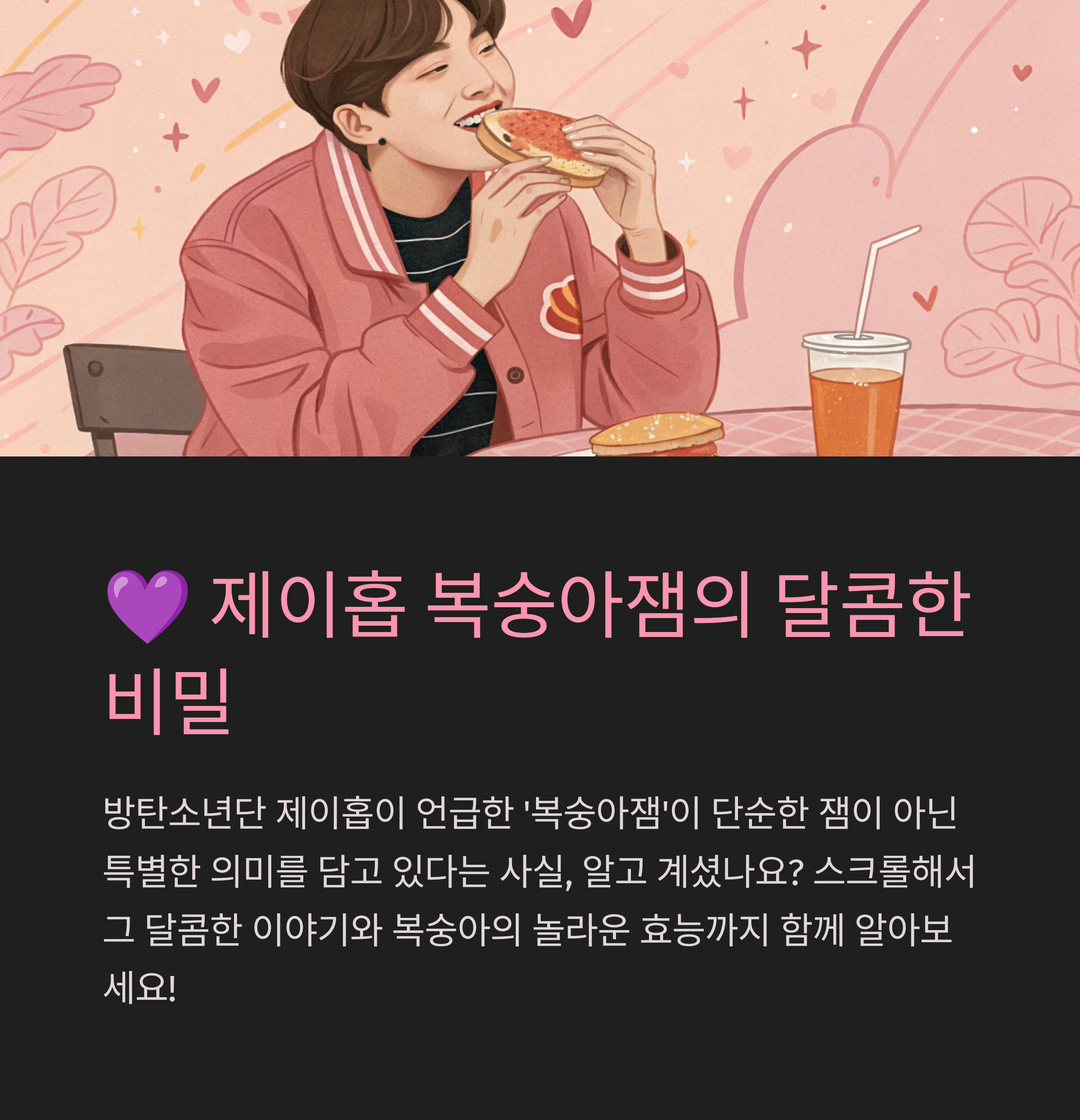 어떠셨어요? 이제 '제이홉 복숭아잼'이라는 말이 더욱 특별하게 느껴지시나요? 복숭아가 가진 달콤함처럼 여러분의 일상에도 행복과 건강이 가득하길 바라요! 💜