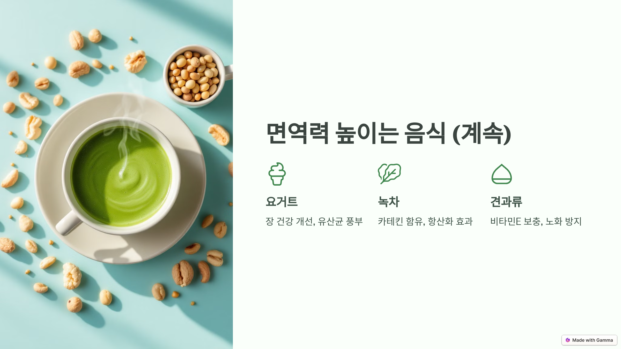 녹차에는 카테킨이라는 성분이 들어 있어 항균 작용이 뛰어나요. 또한 신체의 면역 반응을 활성화해 감기 바이러스와 싸우는 데 도움을 줘요.
