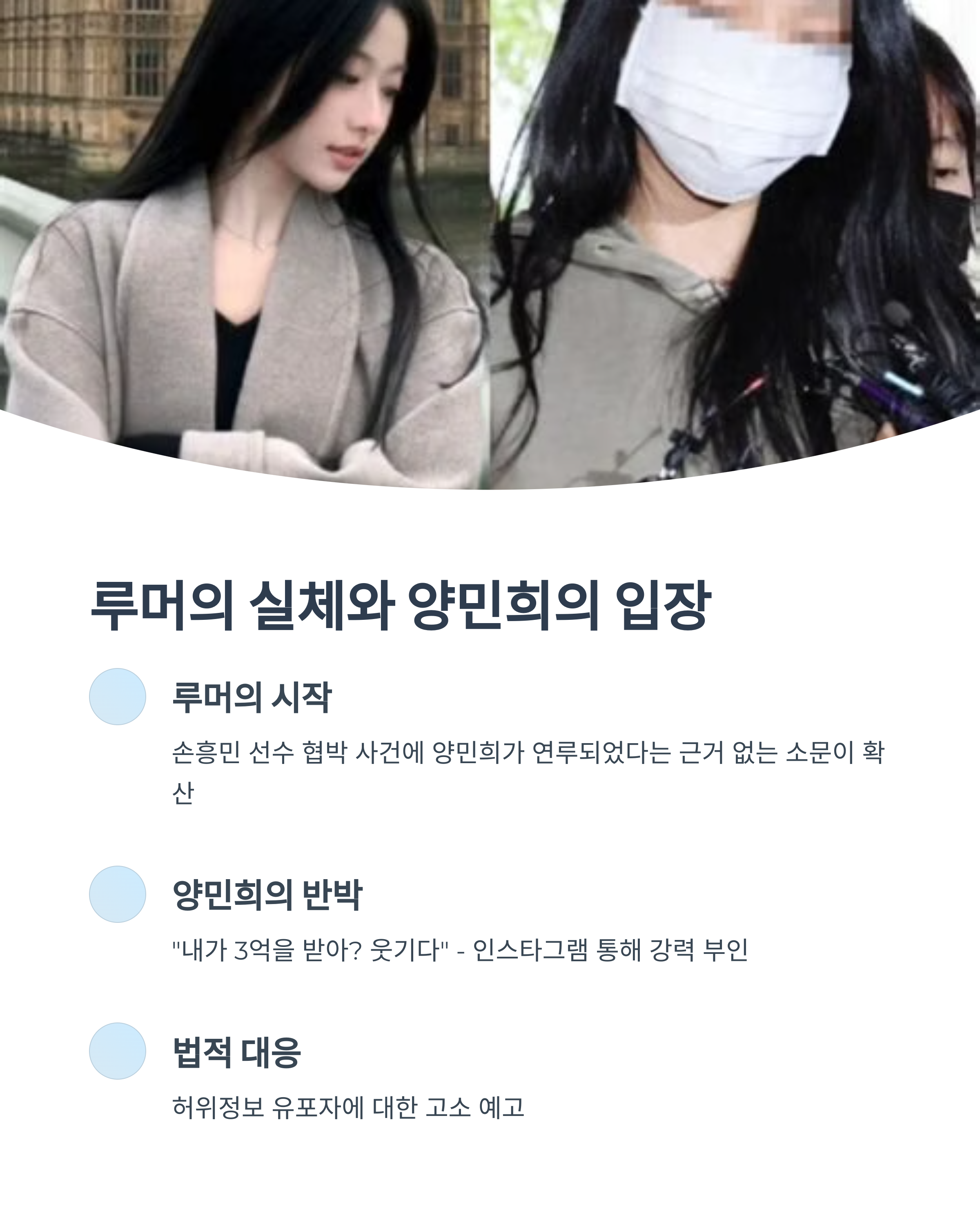 루머의 확산 과정에서 '모델 양민희'라는 이름이 갑자기 등장했습니다. 일부 SNS 게시물과 블로그에서는 특정 인스타그램 계정을 근거로 그녀가 손흥민 선수의 전 여자친구 혹은 협박범이라는 주장을 펼쳤습니다. 그러나 이는 아무런 공식적 근거나 사실 확인 없이 퍼진 추측에 불과합니다.