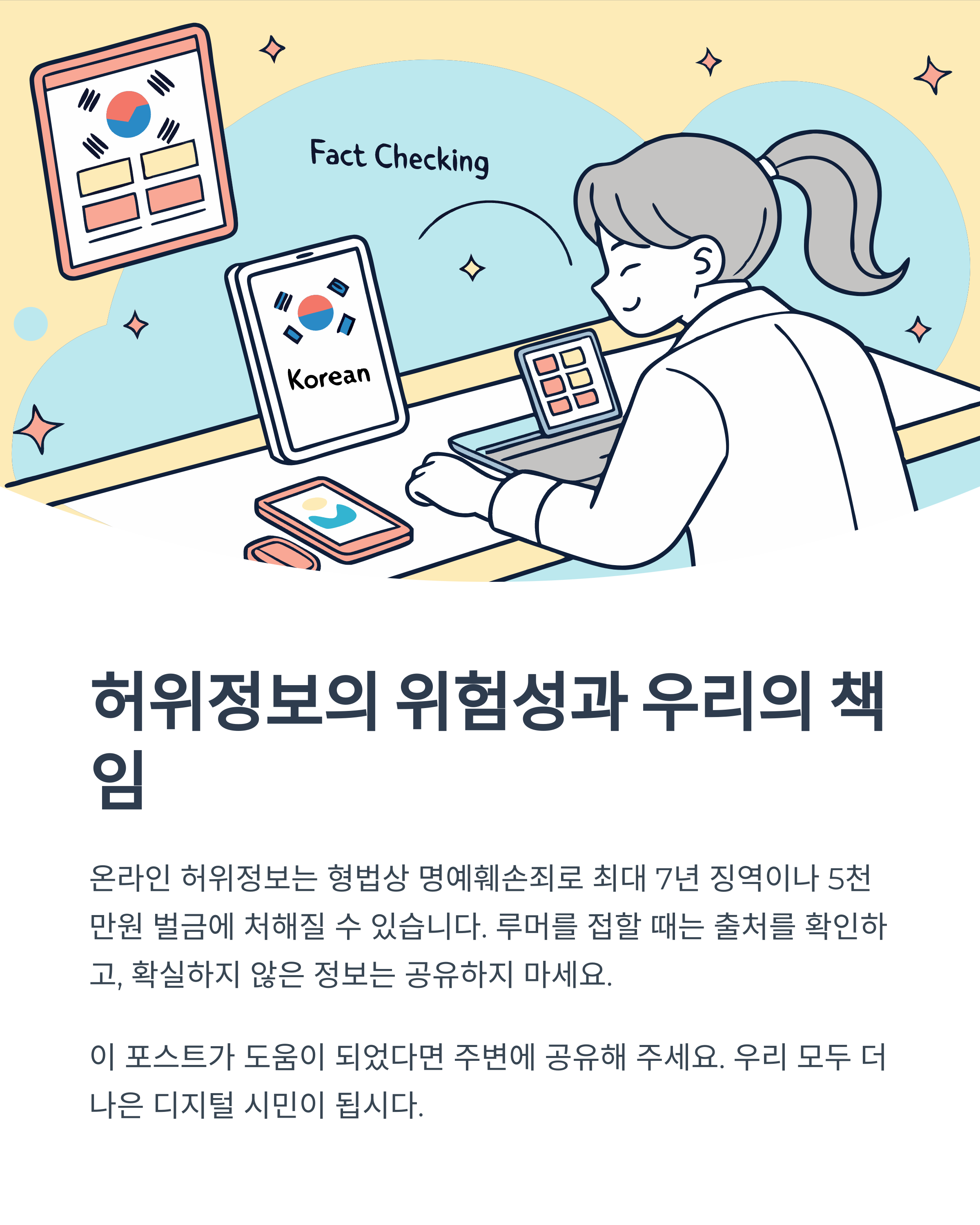 이처럼 허위정보에 대응하기 위해서는 개인의 미디어 리터러시 강화가 필요합니다. 또한 무분별한 공유나 댓글 참여 전에 '사실 확인'이라는 기본 원칙을 지켜야 합니다. 우리 모두가 작은 실천을 통해 루머로 인한 피해를 줄일 수 있습니다.