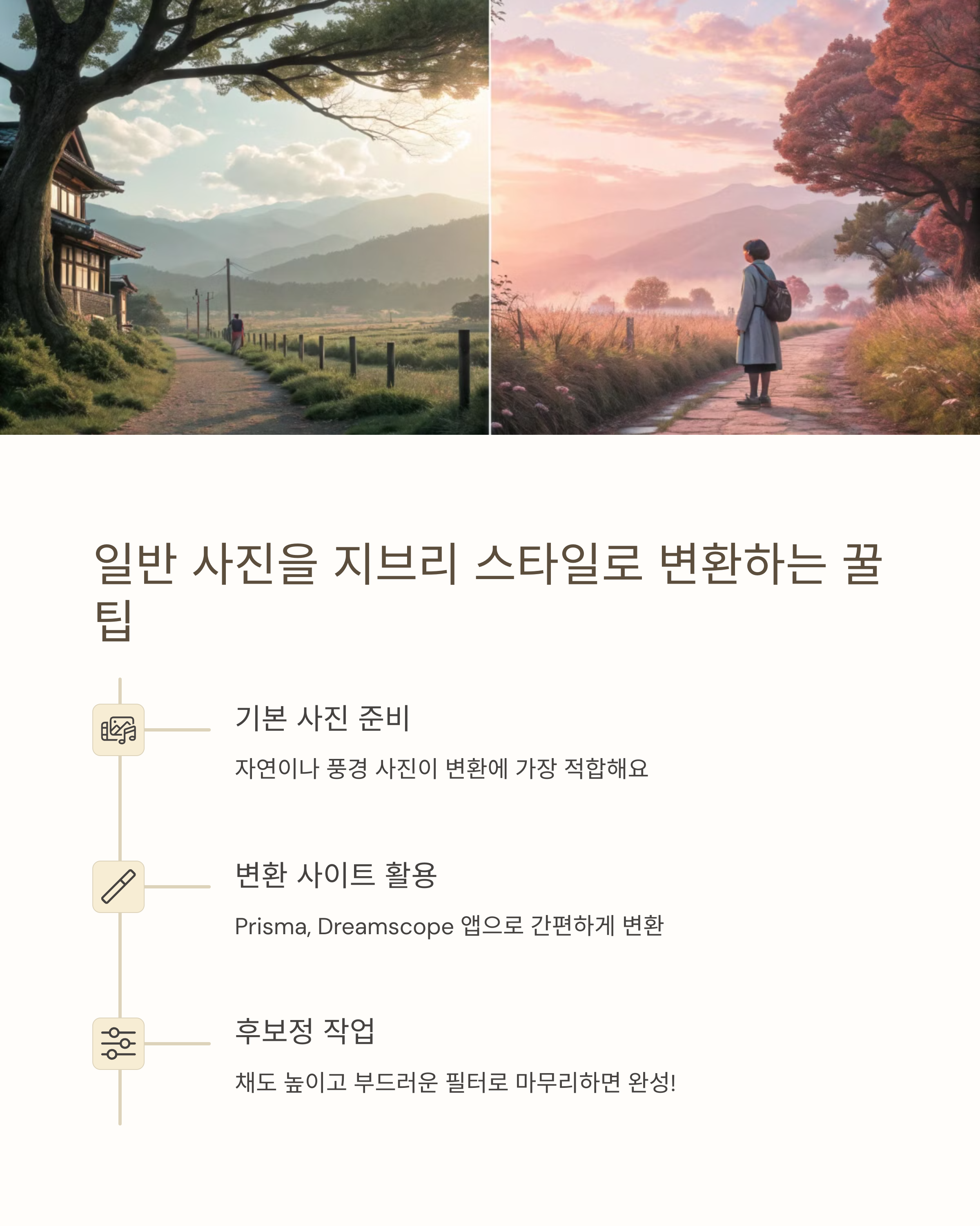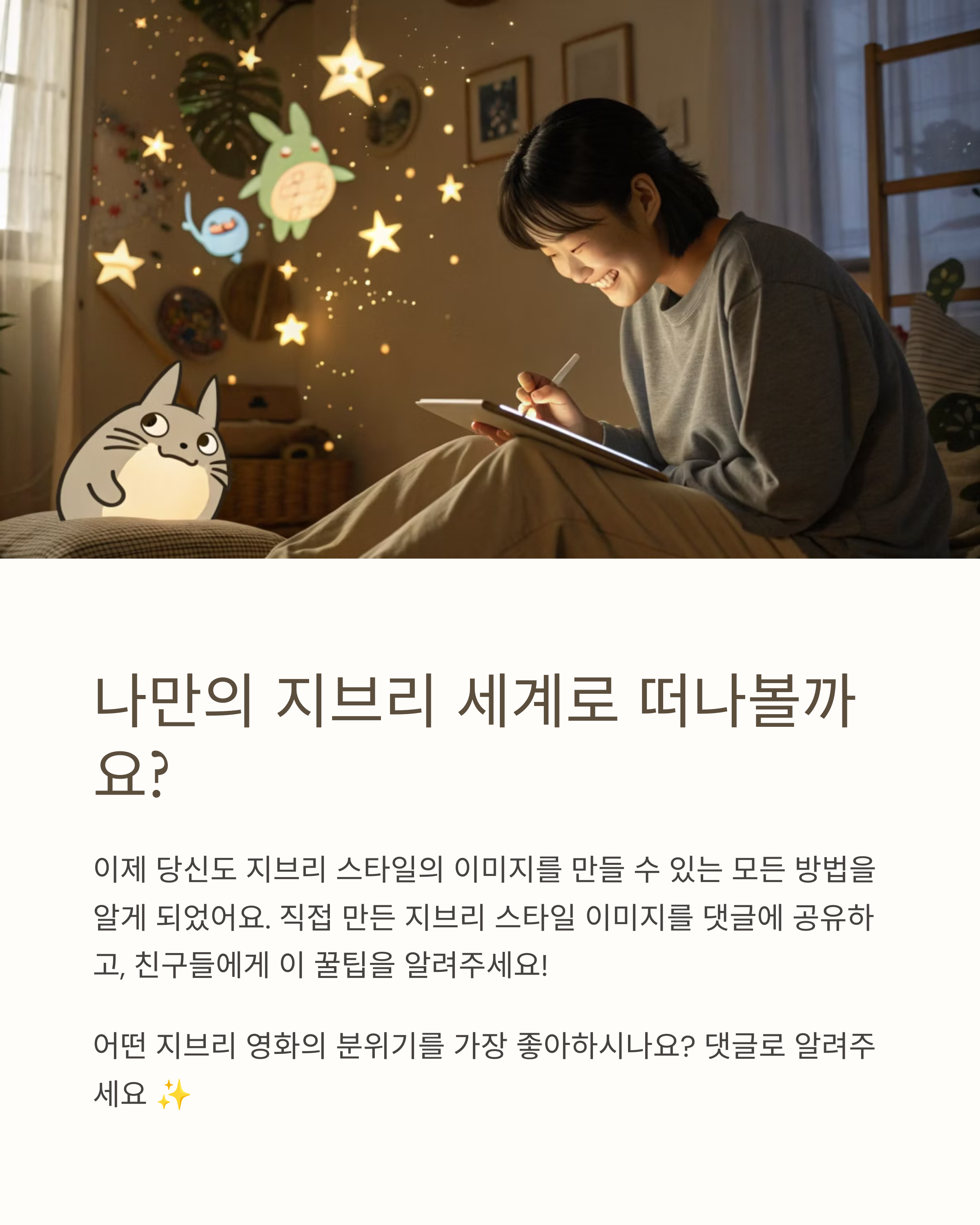 지브리 감성 그대로, 내 손으로 직접 만들 수 있다면 믿으시겠어요? 요즘 SNS에서 핫한 지브리 스타일 AI 이미지, 이제 여러분도 쉽게 만들 수 있어요!