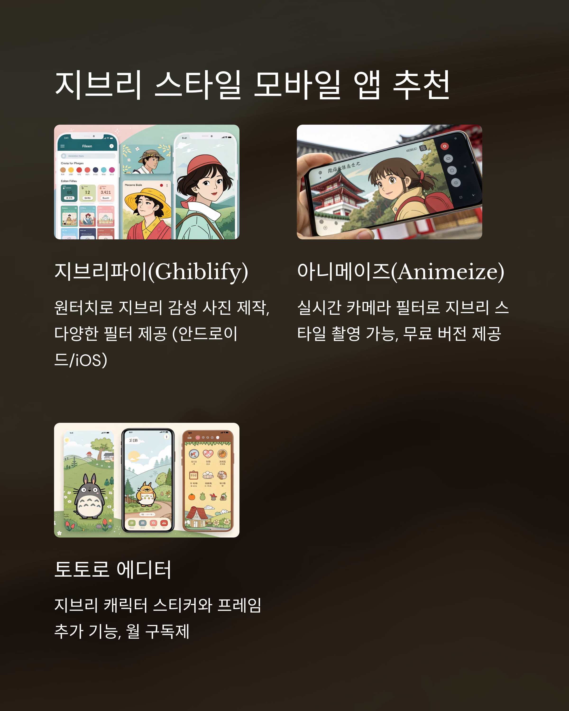 PC 없이도 지브리 스타일 이미지를 만들고 싶다면, 스마트폰 앱이 딱이에요. 앱 중에도 프롬프트 기반 생성이 되는 곳이 꽤 있어요. 아래 리스트 참고해보세요!