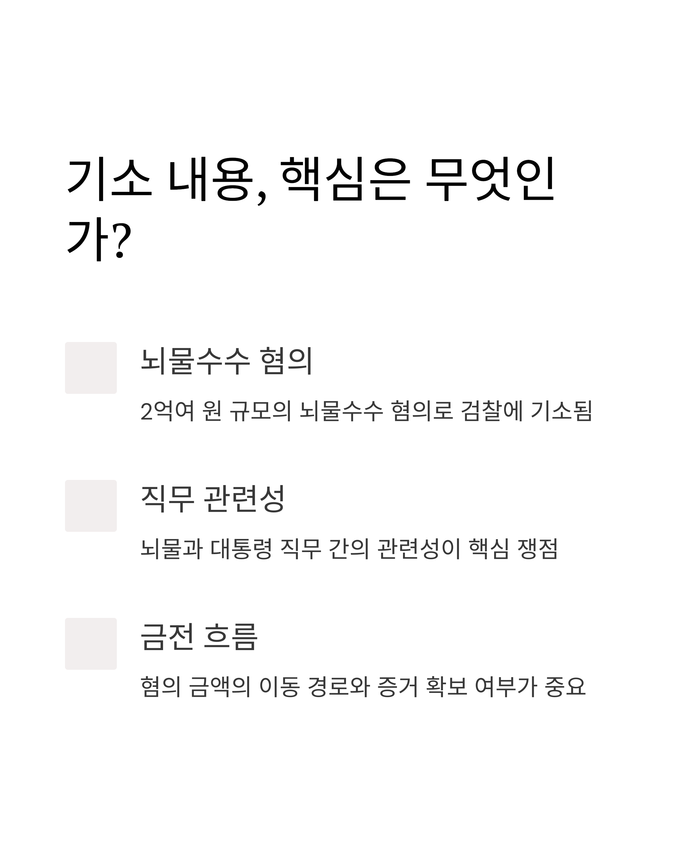 이번 사건의 핵심 법적 쟁점은 크게 세 가지로 정리됩니다. 첫째, 대통령 임기 중 수수한 금품이 ‘직무 관련성’을 갖는지 여부. 둘째, 퇴임 이후 밝혀진 금전 거래가 기소 요건을 충족하는지. 셋째, 증거로 제시된 메모 및 계좌 이체 내역의 법적 효력입니다. 전문가들은 “직무 관련성 입증 여부가 판결의 핵심이 될 것”이라며, 향후 재판에서도 이 부분이 가장 치열하게 다뤄질 것으로 전망합니다.