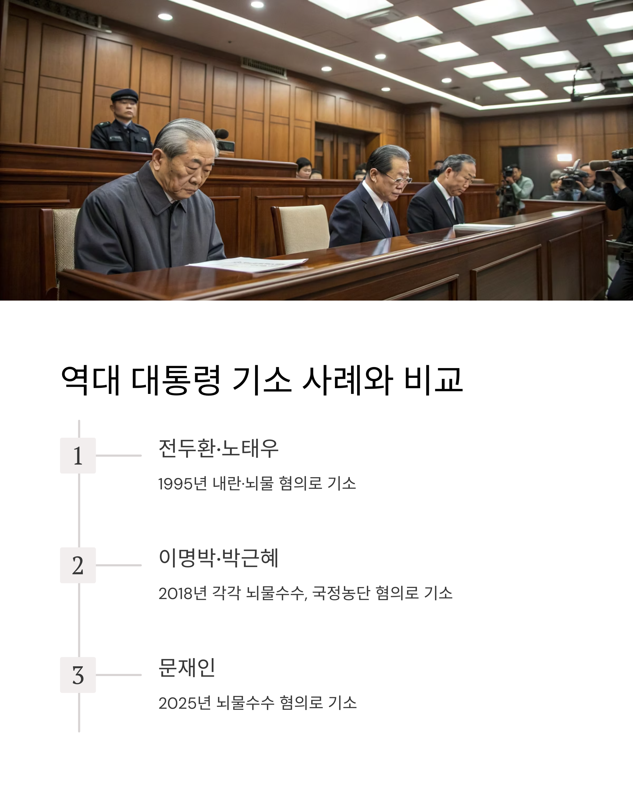 박근혜·이명박 전 대통령과 마찬가지로 뇌물 관련 혐의로 기소되었으며, 정치적 파장이 매우 큽니다.