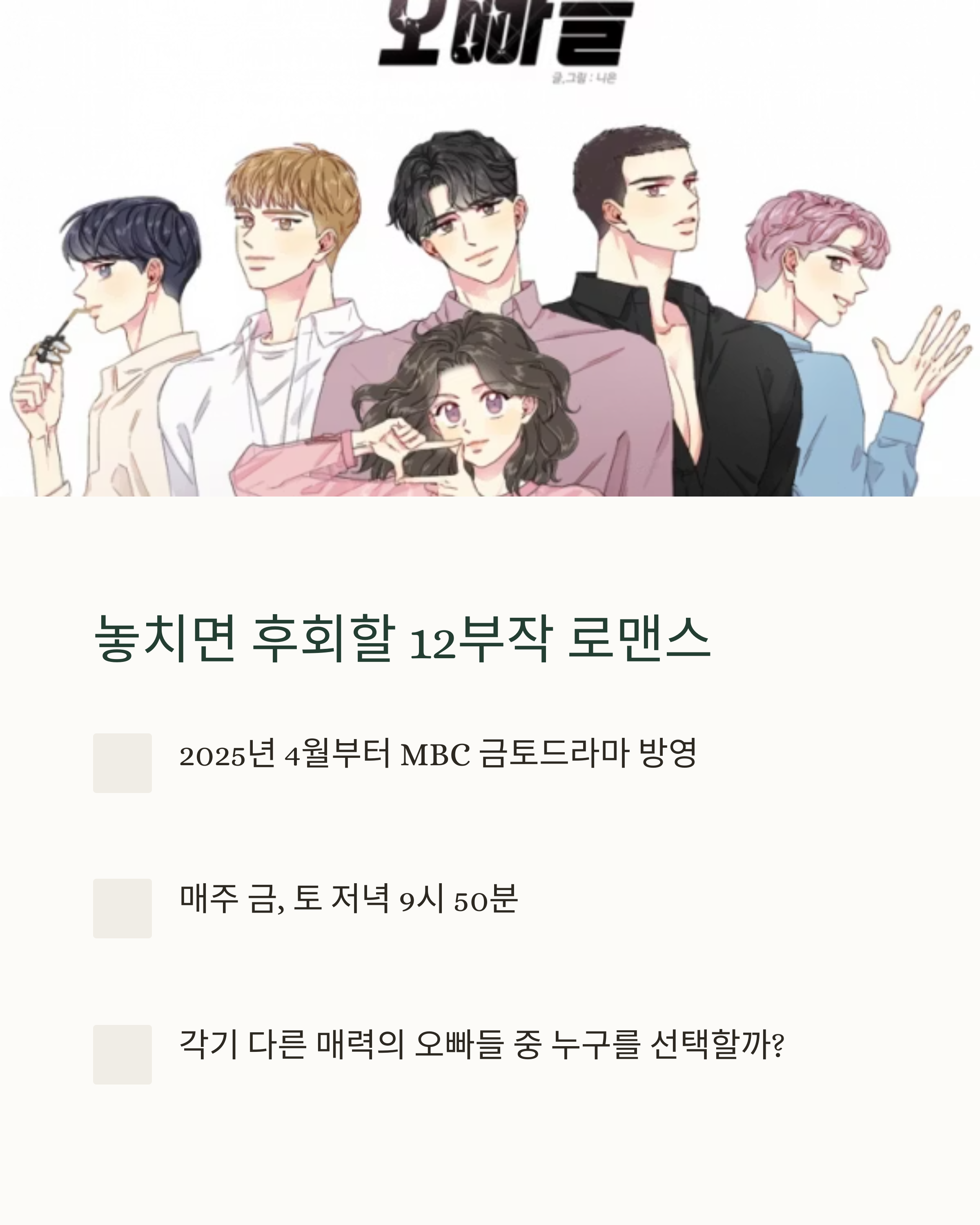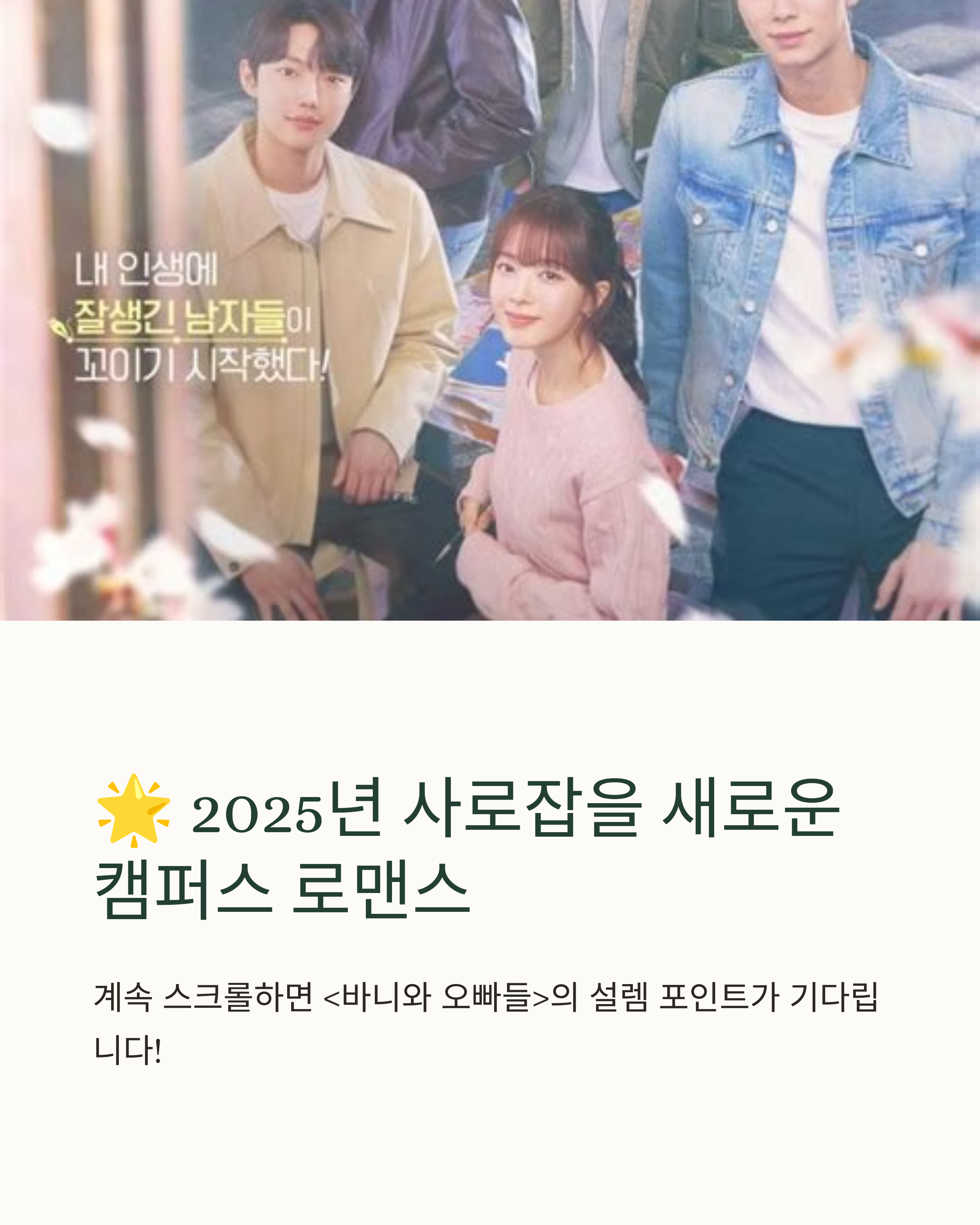 드라마 《바니와 오빠들》은 단순한 로맨스를 넘어서, 각자의 상처와 성장, 그리고 청춘의 찬란함까지 보여주는 이야기입니다. 현실적인 캐릭터 묘사와 눈부신 영상미, 거기에 OST까지 더해지니 몰입도가 장난 아니더라고요. 특히 반희진과 다섯 명의 오빠들이 얽히고설킨 감정선을 따라가다 보면, 어느새 한 명쯤은 내 이상형으로 저장하게 될지도 몰라요 😍