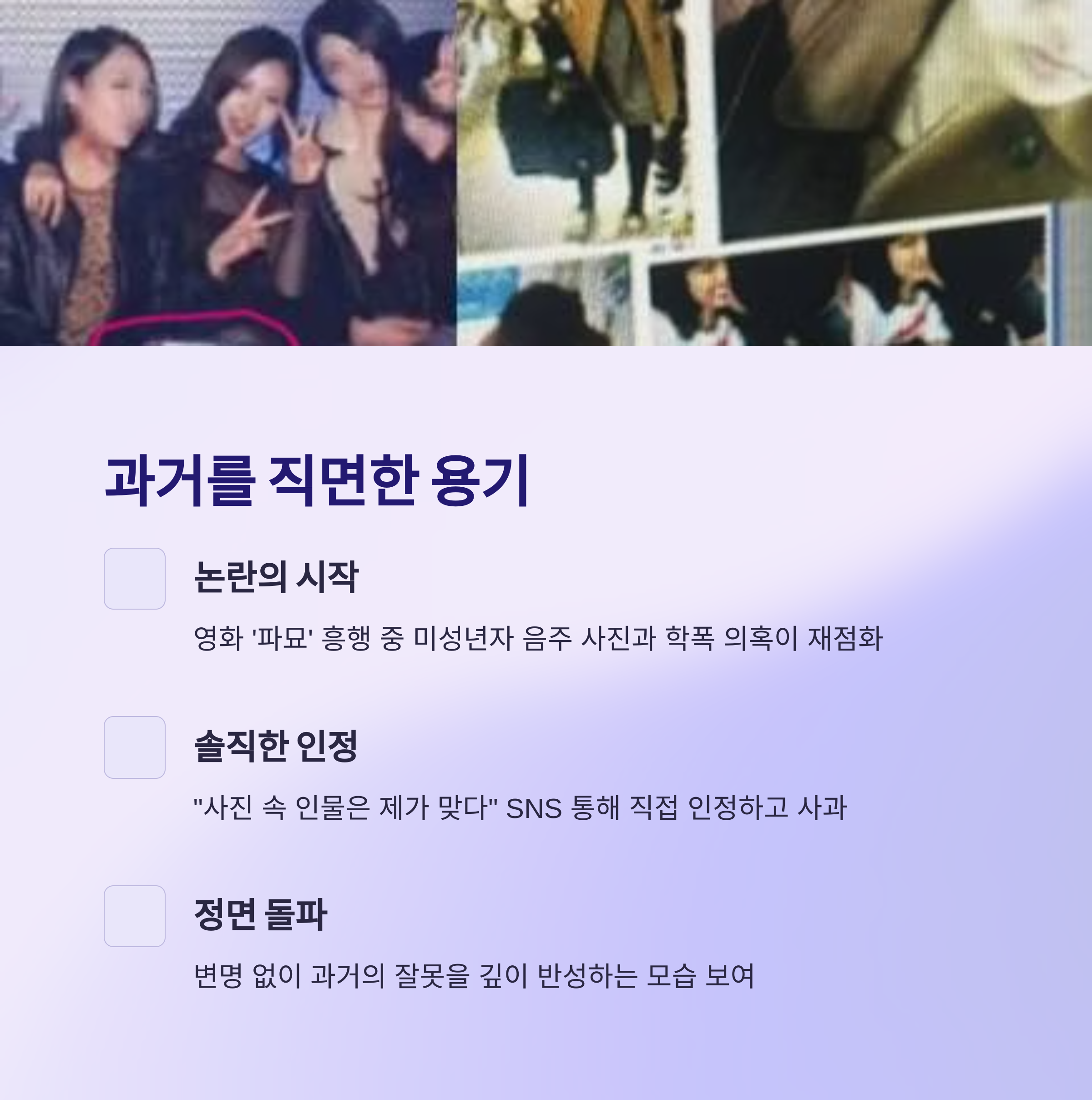 시간이 흘러 2024년, 고민시 씨가 영화 <파묘>로 큰 사랑을 받던 시점에 다시 한번 과거가 수면 위로 떠올랐습니다. 특히 이번에는 단순한 학폭 의혹을 넘어, 미성년자 시절 음주 사진이 결정적인 증거로 제시되었어요. 사진 속 인물이 고민시 씨와 매우 흡사하다는 주장이 이어졌고, 여론은 점점 악화되기 시작했죠. 대중은 과거의 잘못을 어떻게 대하고 인정하는지에 촉각을 곤두세웠습니다.