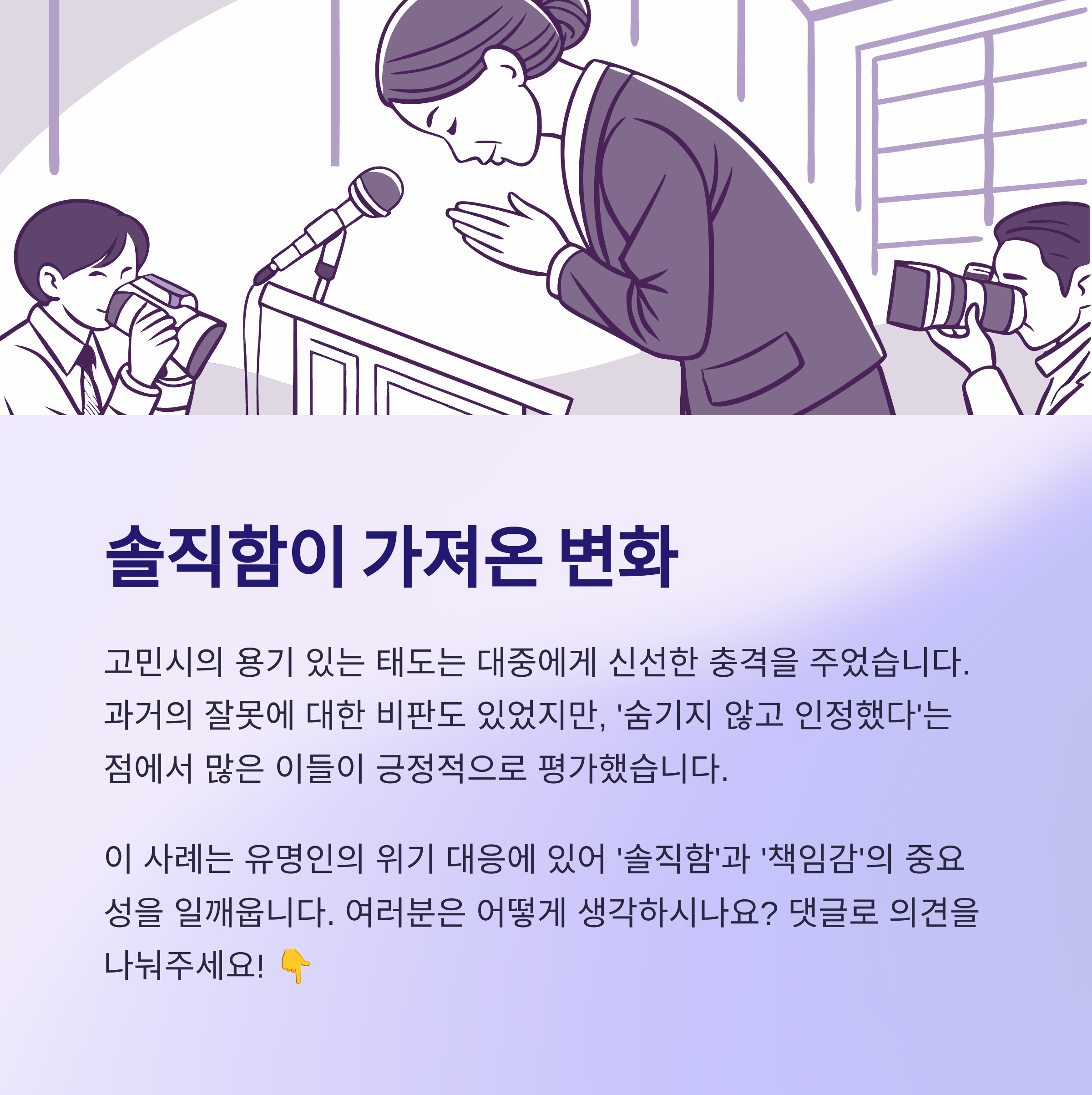 - 2. 시기의 중요성: 논란 초기부터 빠르게 인정하고 사과하는 것이 장기적으로 더 나은 결과를 가져올 수 있습니다.