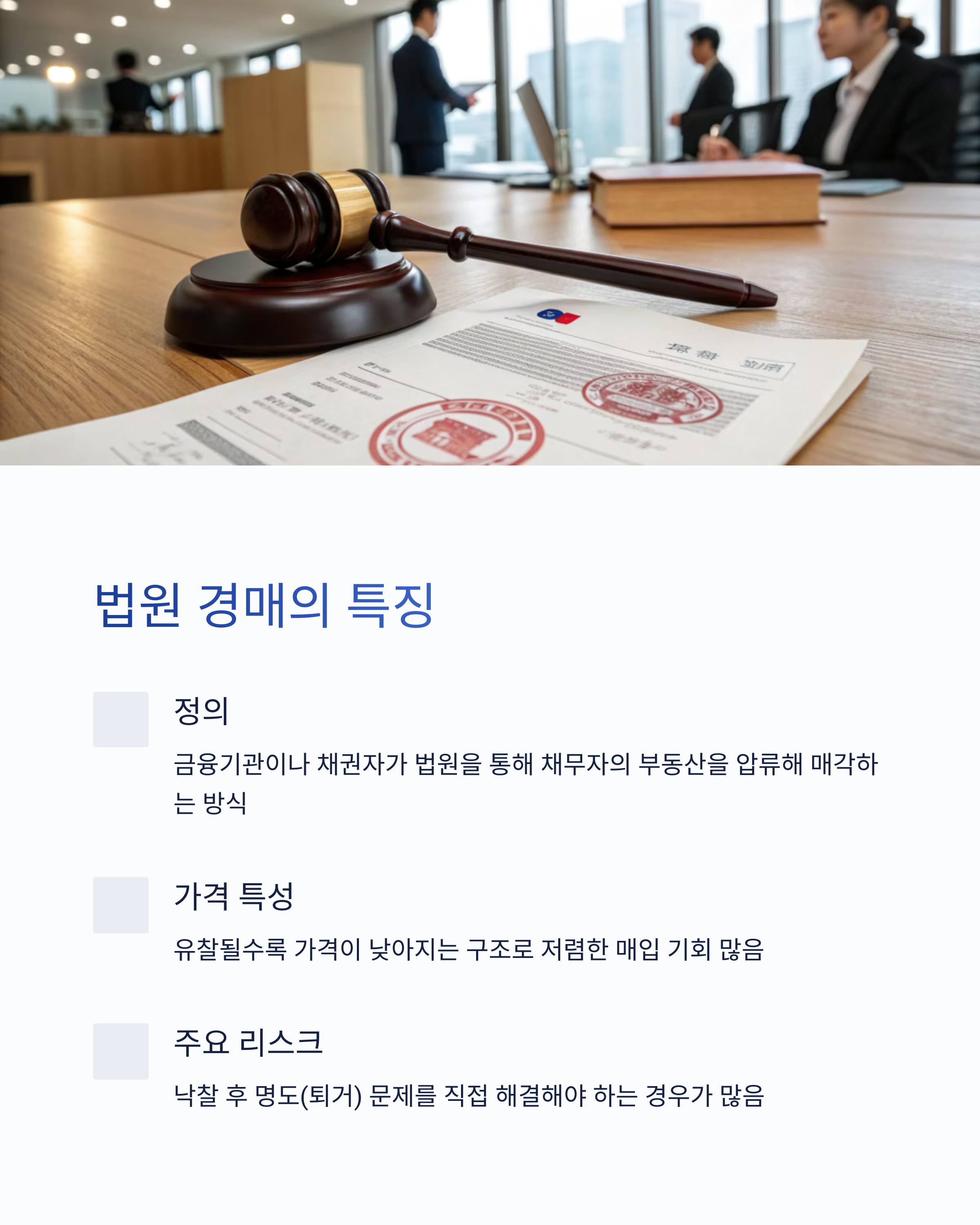 • 📌 주관 기관: 법원 경매는 법원이, 공매는 공공기관이 진행합니다.
