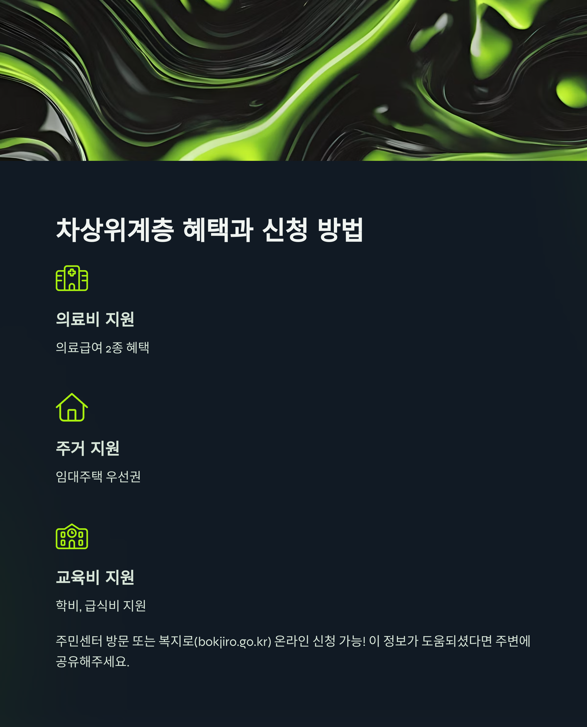 - 주요 혜택: 의료비, 교육비, 자활, 주거, 문화 등 생활 전반에 걸쳐 다양한 지원을 받을 수 있답니다.