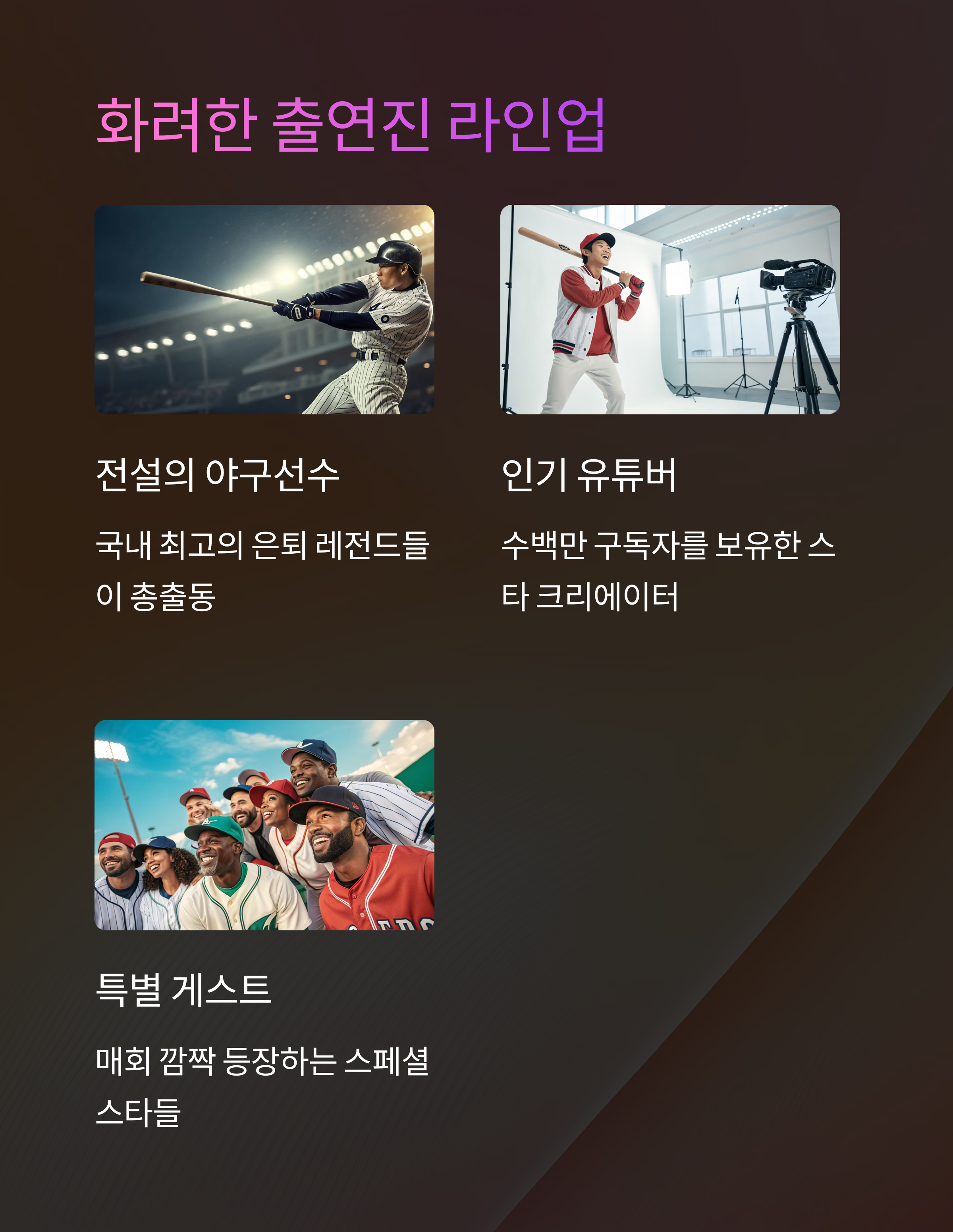 벌써부터 "이 조합 실화냐"는 말이 나올 정도로 출연진이 화려합니다. 전설급 프로야구 선수들과 인기 유튜버의 만남, 여기에 예능감 터지는 감독진까지! 아래는 공식적으로 공개된 1차 선수 명단입니다.