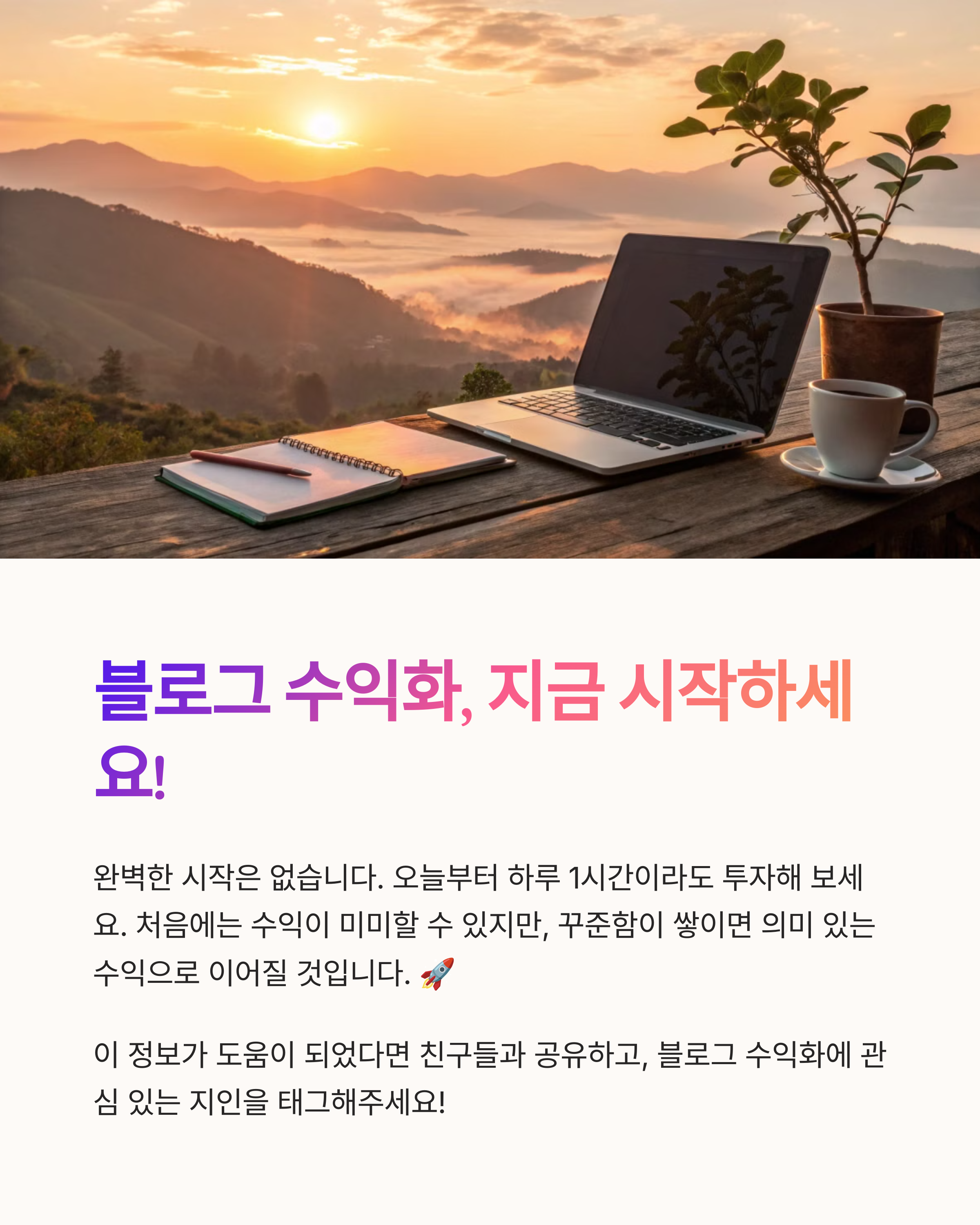 블로그 수익화는 단기간에 성공할 수 있는 일이 아니지만, 꾸준한 노력과 전략적인 접근이 있다면 하루 1시간 투자로도 충분히 가능성이 있습니다. 중요한 것은 일관된 콘텐츠 제작과 SEO 최적화, 그리고 트래픽 증가 전략을 지속적으로 실행하는 것입니다. 지금 바로 블로그를 시작하고, 첫 글을 작성해 보세요! 꾸준함이 결국 성공을 만듭니다.