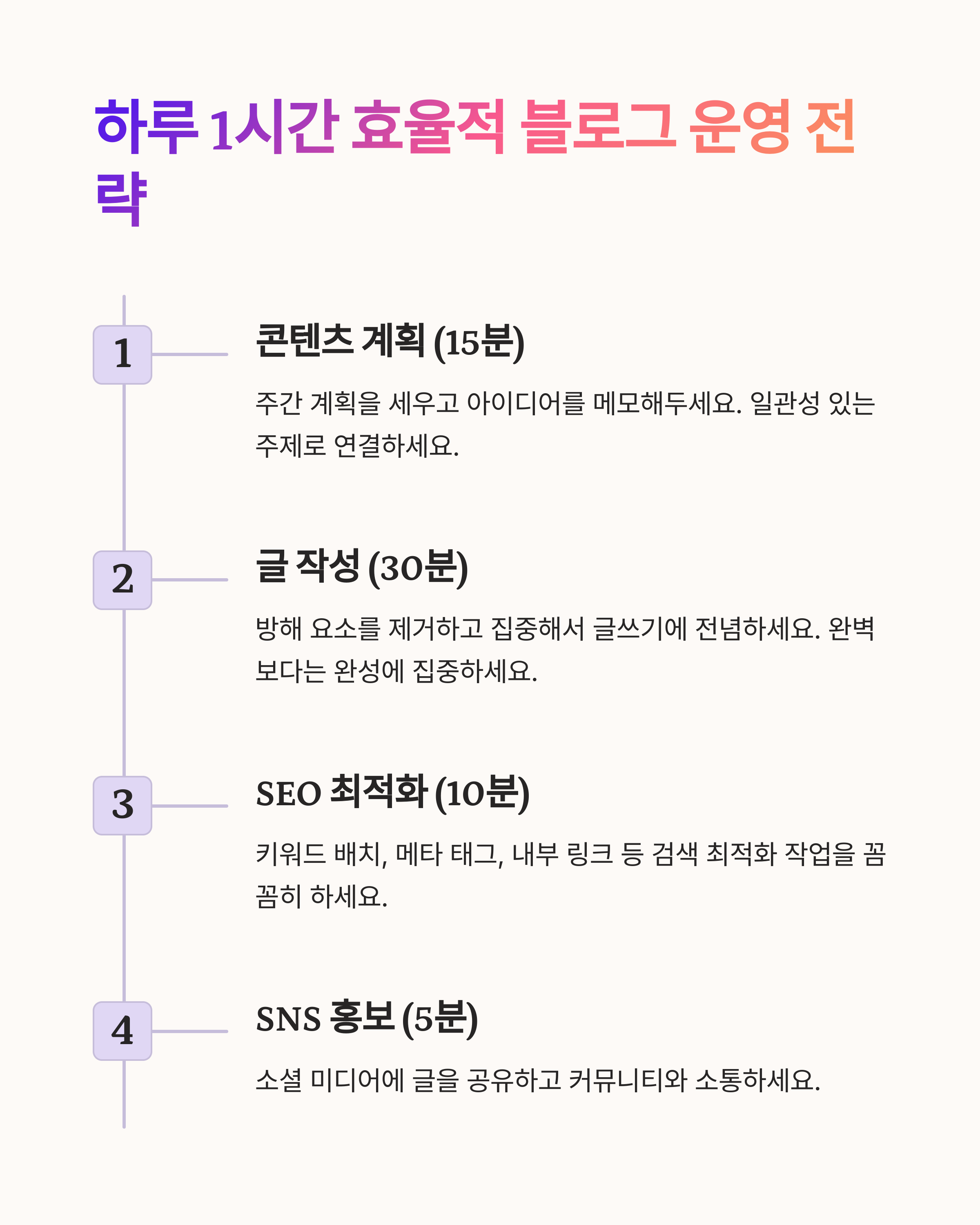 블로그 운영에 하루 1시간만 투자한다고 가정했을 때, 효과적으로 시간을 활용하는 것이 중요합니다. 한정된 시간을 최대한 활용하기 위한 전략을 다음과 같이 정리할 수 있습니다.