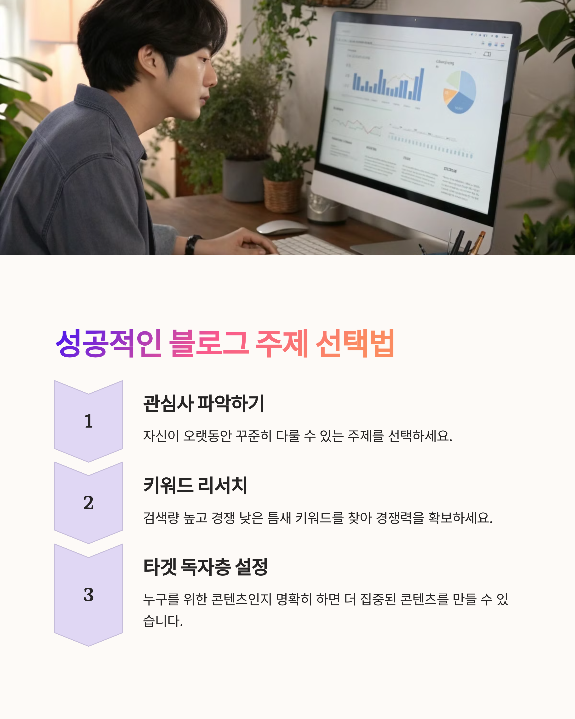 - 주제 선정: 검색량이 많고 경쟁이 적은 키워드를 찾아 글감 준비