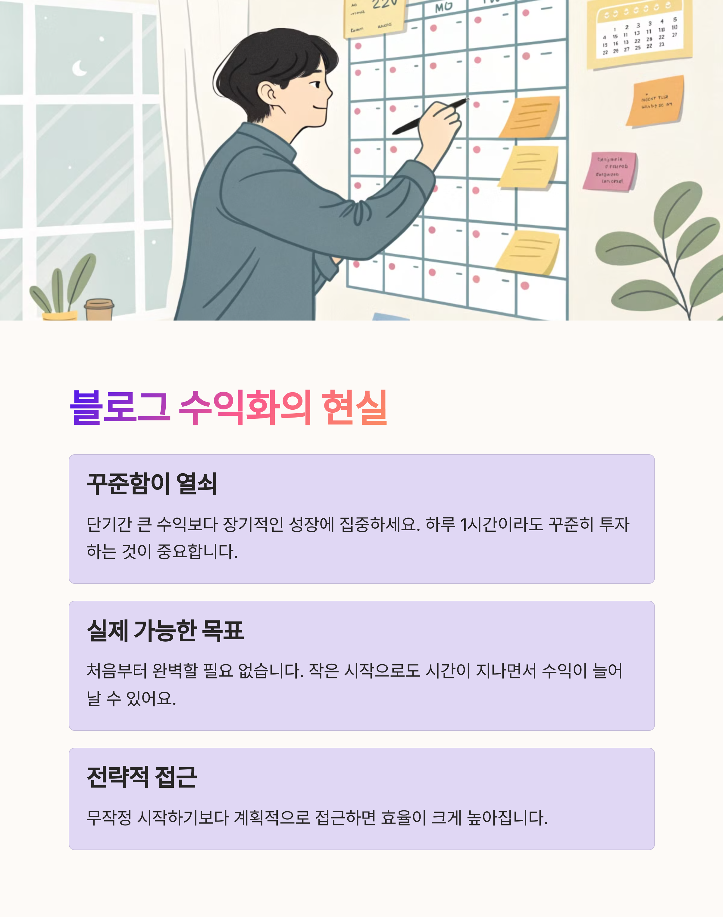 - 수익화만 집중: 너무 빨리 돈을 벌려는 접근은 오히려 방문자를 잃게 만들 수 있습니다.