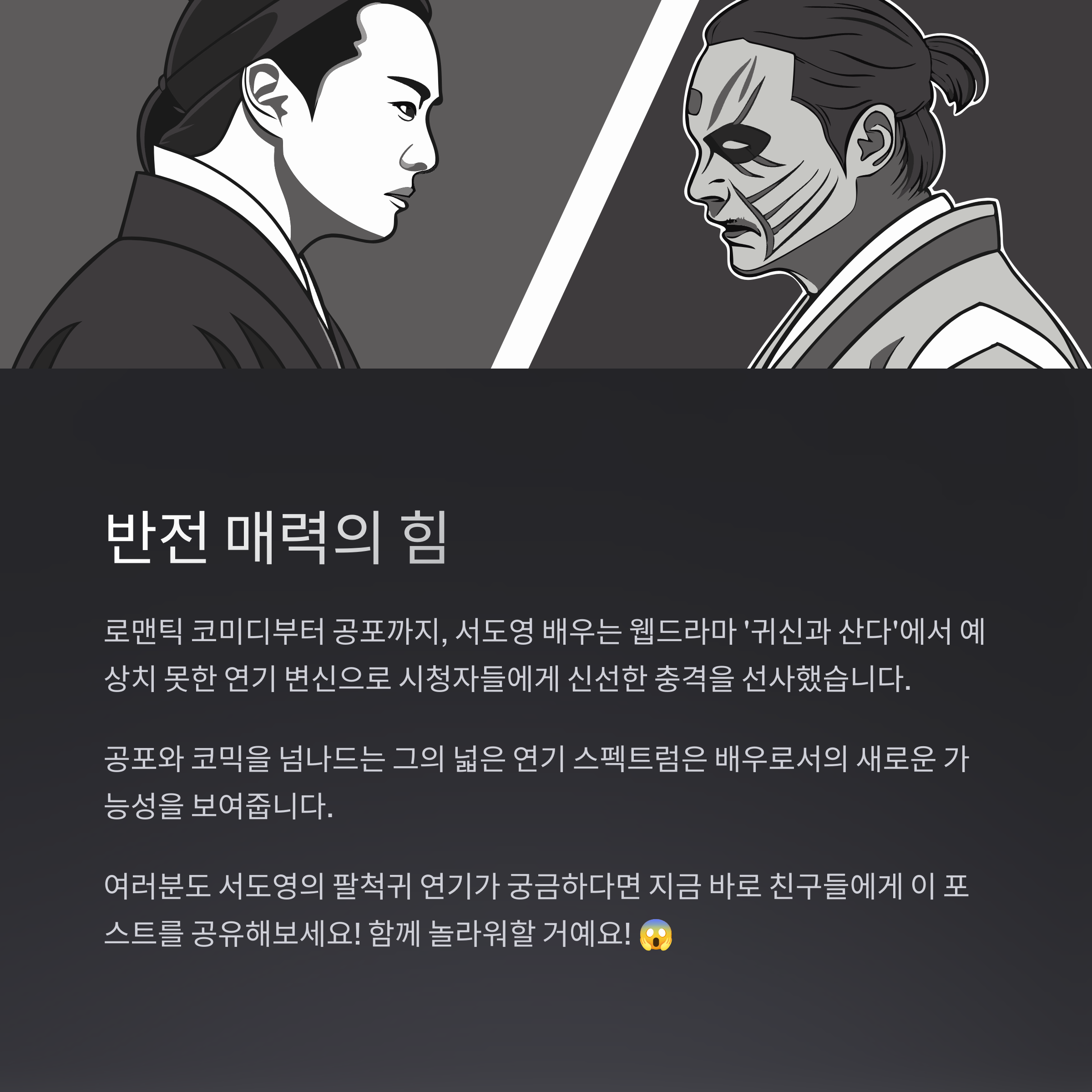 정말 서도영 배우가 팔척귀를 연기했다는 사실을 처음 들었을 때의 놀라움은 잊을 수 없네요. 하지만 역시 '믿고 보는 배우'라는 말이 괜히 있는 게 아니라는 걸 다시 한번 깨달았어요. 이런 멋진 변신은 언제나 환영이죠!