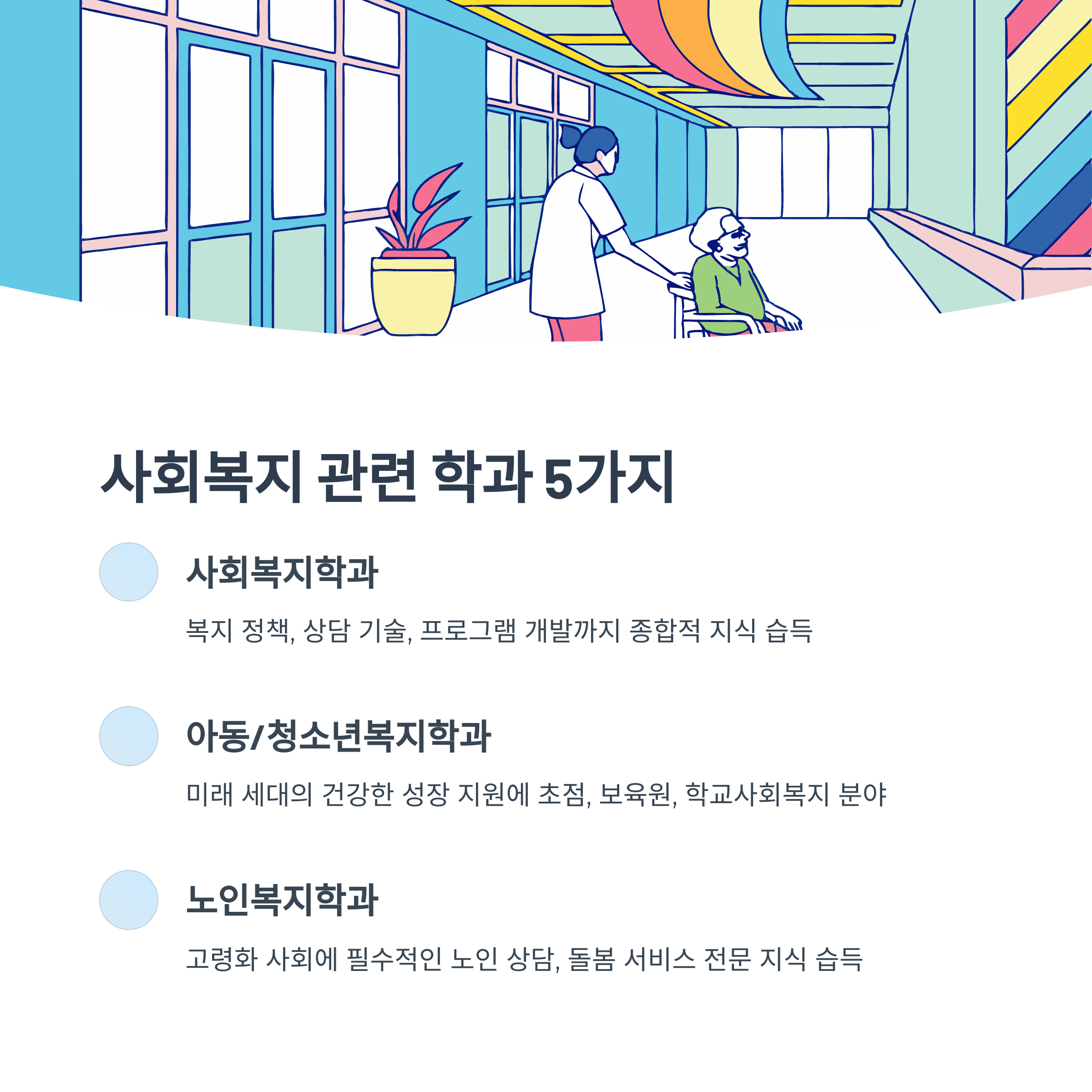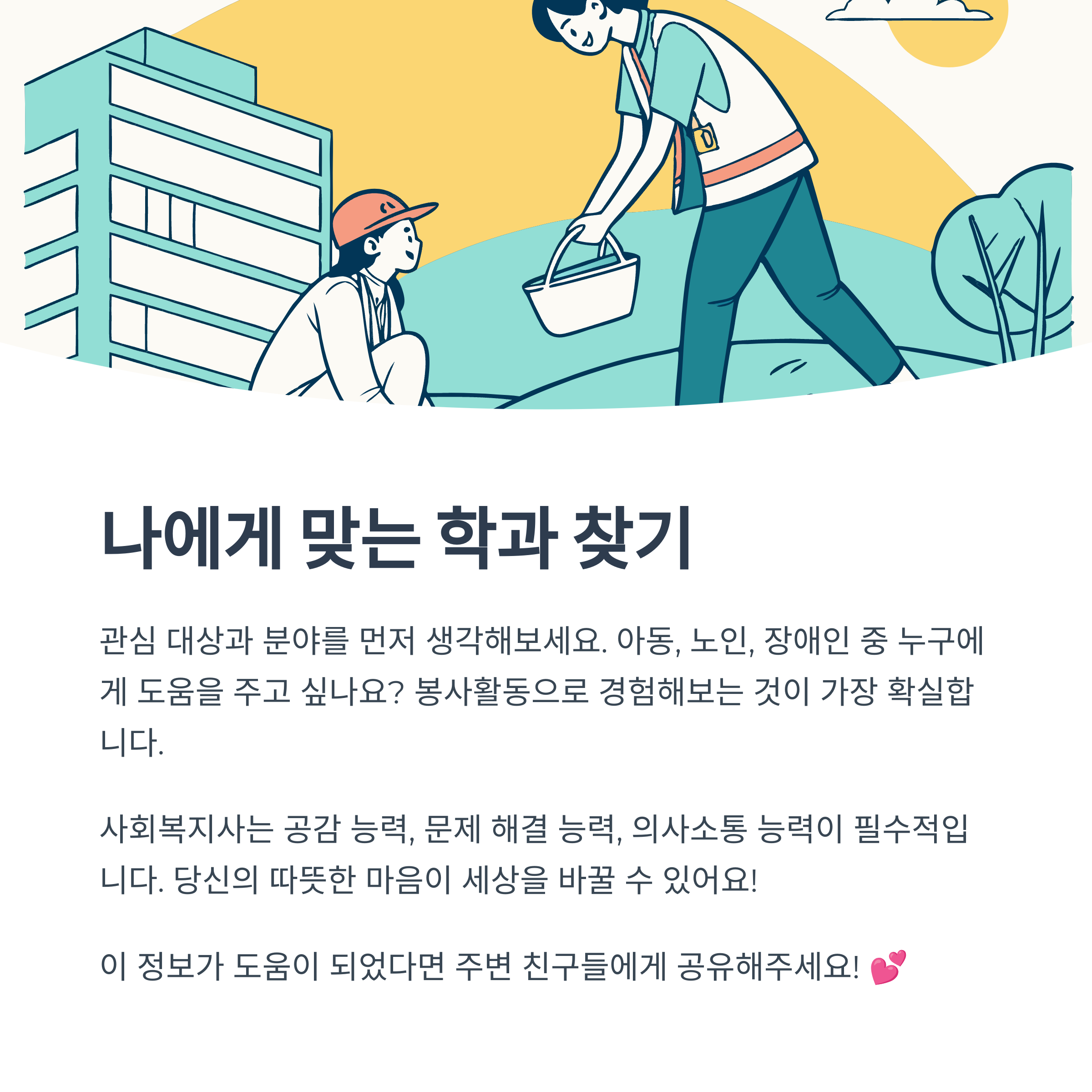 사회복지사의 길을 걷고자 하는 여러분을 위해, 사회복지 관련 학과 선택부터 필요한 역량까지 핵심 내용을 요약해 봤어요!