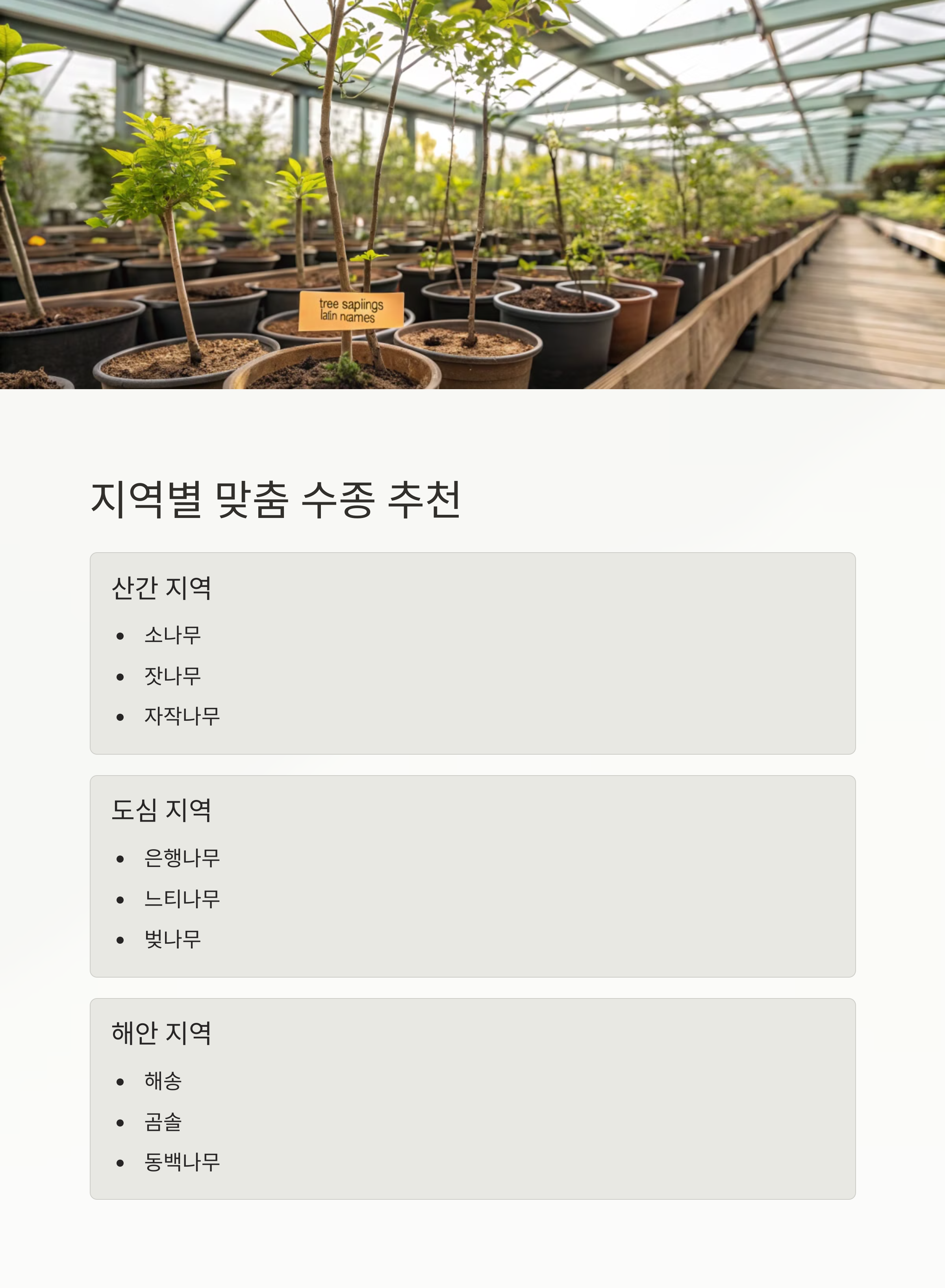 각 지역마다 토양과 기후 특성이 달라서, 무턱대고 아무 나무나 심으면 생존률이 낮을 수 있어요. 그래서 꼭 맞춤형 수종을 선택해야 합니다. 아래 표는 지역별 추천 나무를 정리한 가이드예요. 참고하셔서 더 건강한 숲을 만들어보세요!