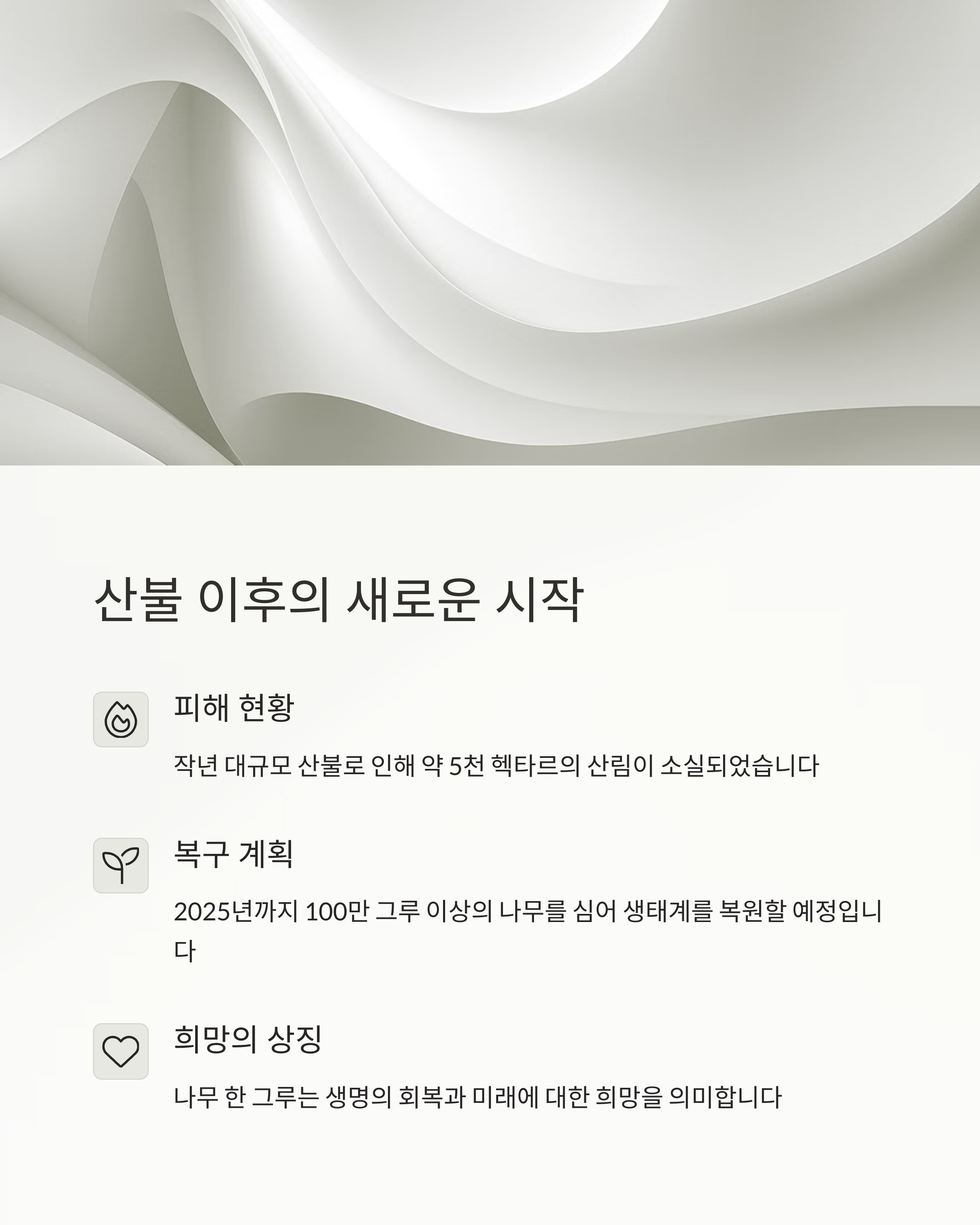 2025년 봄의시작, 기록적인 건조한 속에서 전국 각지에서 대규모 산불이 발생했습니다. 특히 강원도와 경상북도 일부 지역은 마치 전쟁터처럼 불길에 휩싸였고, 수천 헥타르의 숲이 하루아침에 사라졌습니다. 주민들의 삶도 송두리째 무너졌고, 산림에 기대 살아가던 생태계는 말 그대로 붕괴 상태에 놓였습니다. 그런데요, 그 폐허 속에서도 새싹은 틔우더라고요. 자연은 그렇게, 아주 천천히 그러나 확실하게 회복을 다시 해야 하고 있었어요. 그 모습에서 위로와 희망을 느낀 분들, 분명 저만은 아니었을 거예요.