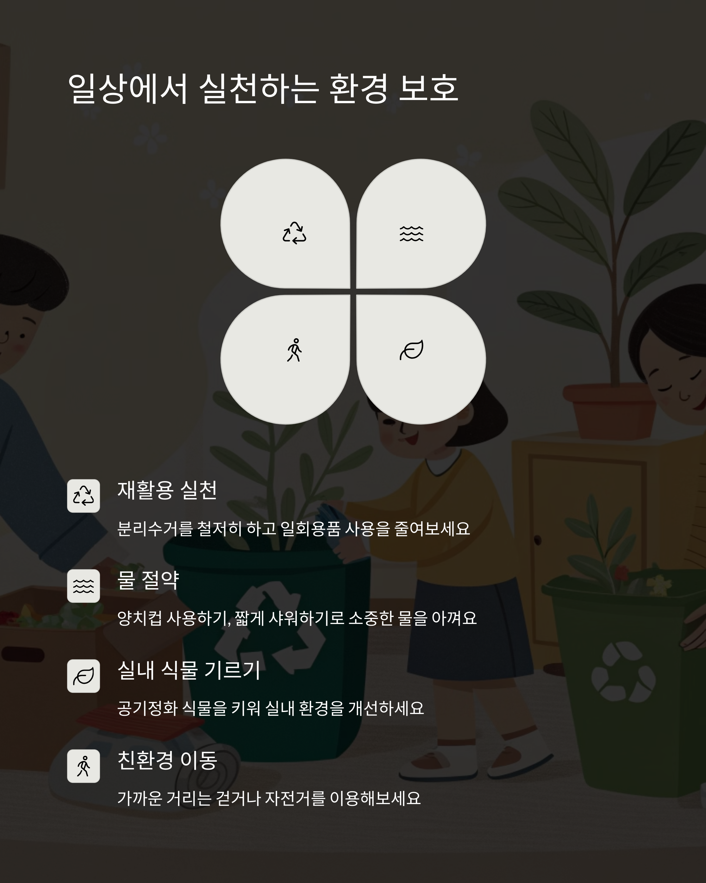 물 절약, 쓰레기 줄이기, 대중교통 이용하기 같은 생활 속 습관이 장기적으로 지구를 살리는 힘이 됩니다.