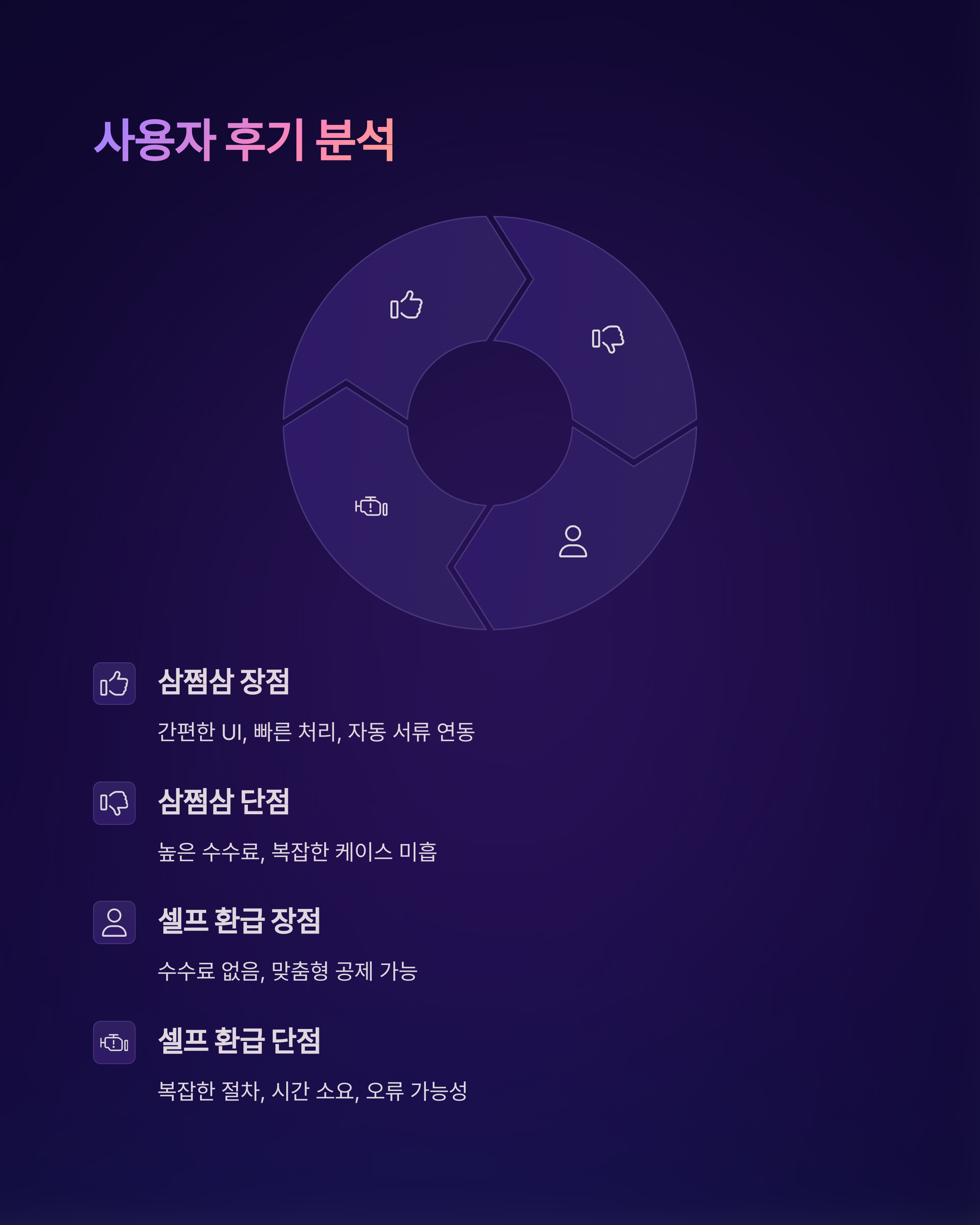 사용자들의 평가는 극과 극입니다. 일부는 "앱만 설치하면 끝나서 좋다"고 하며 만족하지만, 다른 일부는 "환급받은 금액보다 수수료가 더 충격적이었다"고 말합니다. 다음은 실제 사용자들의 공통된 평가 요소입니다.