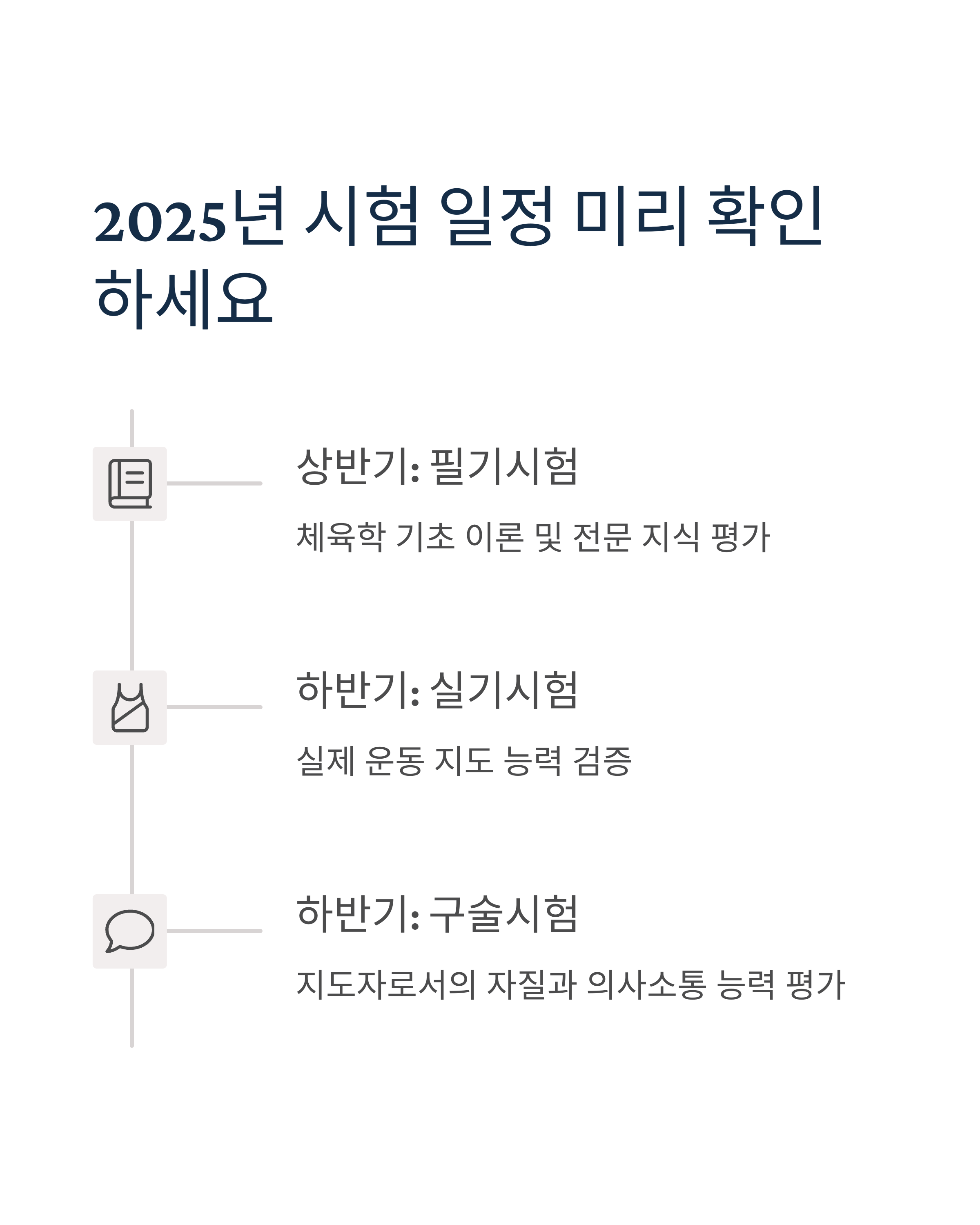 2025년 생활체육지도자 2급 시험은 보통 상반기(4~5월) 필기시험, 하반기(7~9월) 실기 및 구술시험으로 구성됩니다.