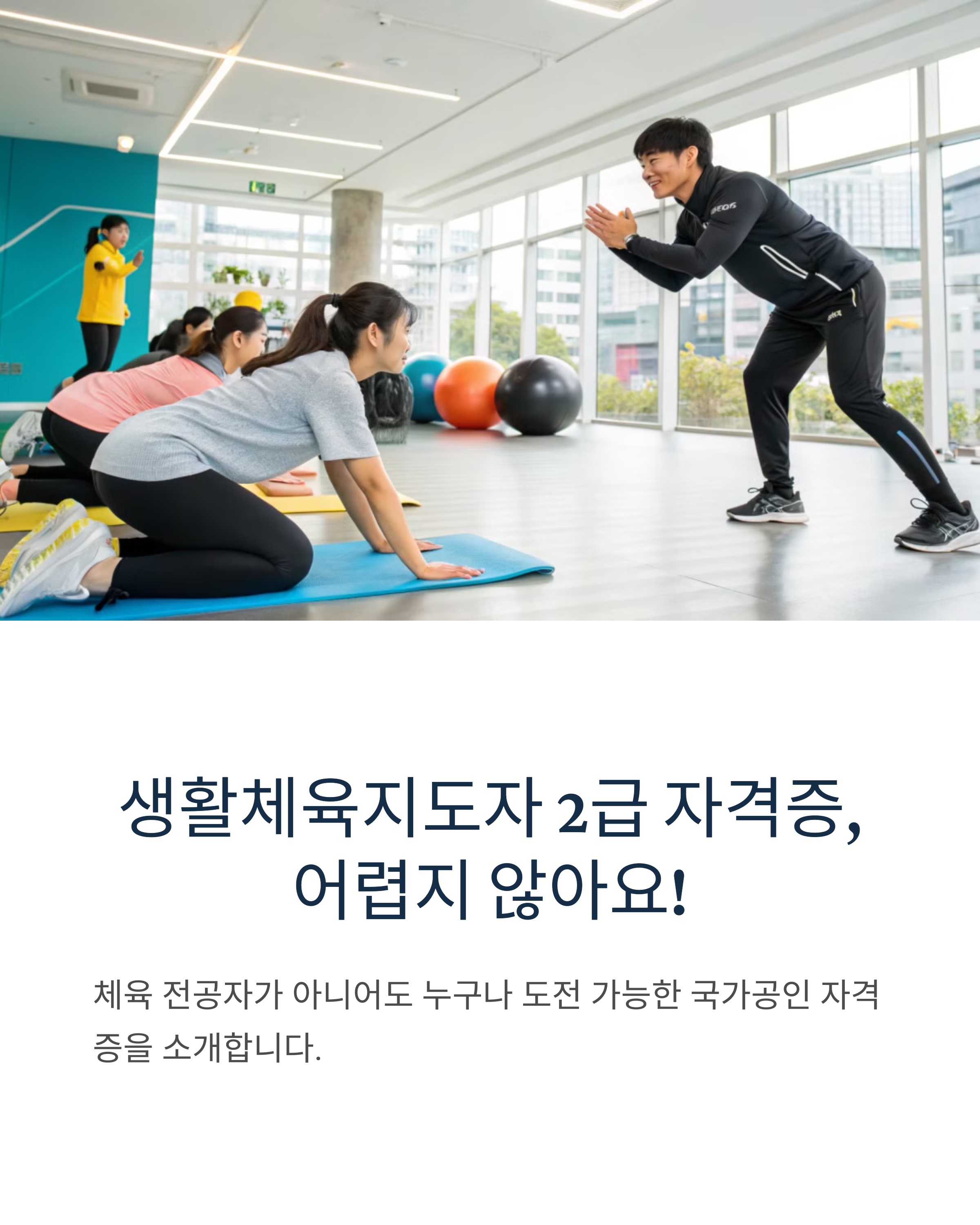 생활체육지도자 2급은 국민체육진흥공단이 주관하는 국가공인 자격증으로, 지역 사회에서 건강 증진과 체육 활동을 지도할 수 있는 전문성을 인정받는 자격입니다. 쉽게 말해 헬스장, 체육관, 복지센터 등에서 일반인을 대상으로 운동을 지도할 수 있게 되는 자격이죠. 1급과 달리 대학 전공자가 아니어도 응시할 수 있어서 입문용 자격증으로도 많이 추천돼요.