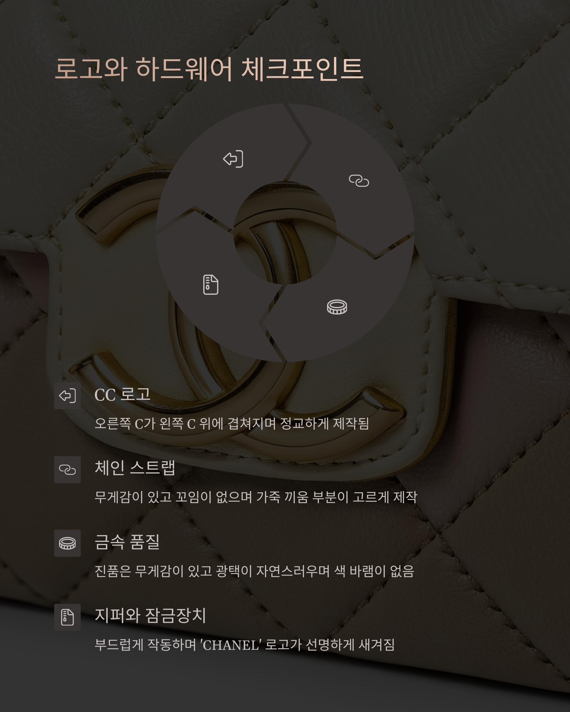 로고 C의 교차 방향, 체인의 자성 여부, 바느질 패턴과 홀로그램 시리얼 확인이 핵심입니다.