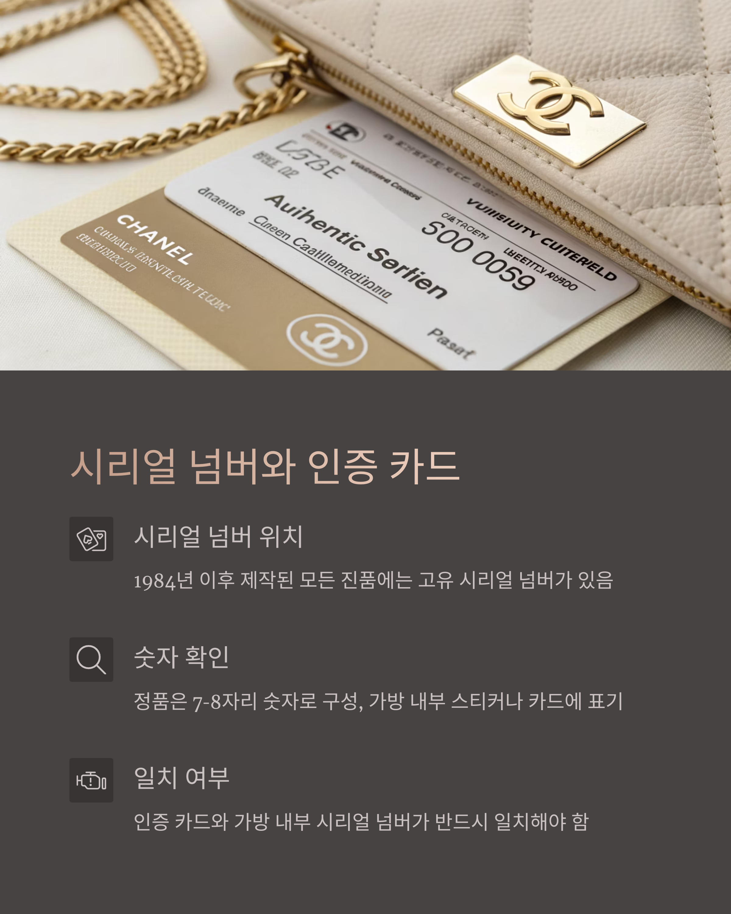 샤넬 가방에는 내부에 시리얼 넘버가 포함된 홀로그램 스티커가 부착되어 있으며, 보증서(Authenticity Card)에 동일한 번호가 기재되어야 합니다. 연도별로 시리얼 번호의 자릿수가 다르며, 예를 들어 2005년 이후는 8자리 번호를 사용합니다. 진품의 경우 홀로그램은 번짐 없이 정밀하게 인쇄되며, 빛 반사에 따라 무지개 빛이 보입니다.